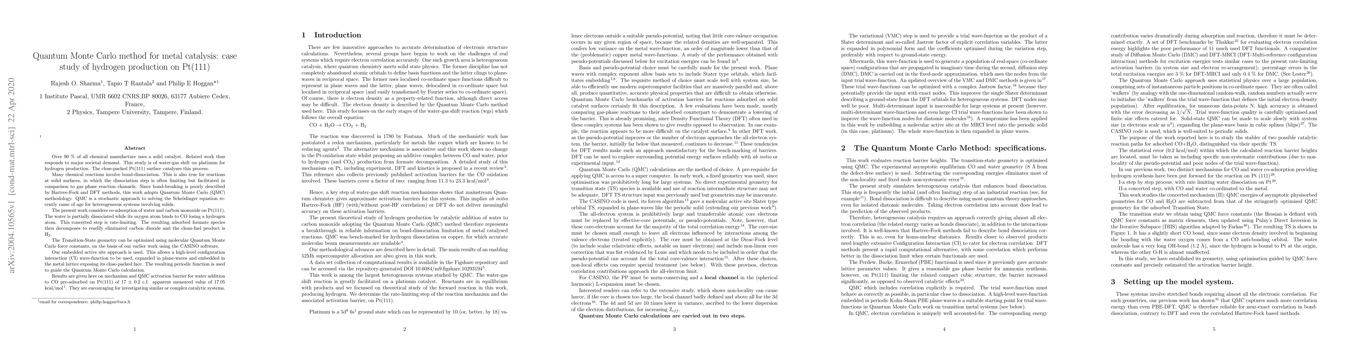 This study employs Quantum Monte Carlo (QMC) methodology to investigate the catalytic hydrogen production via water-gas shift on Pt(111). The QMC approach provides accurate results for the rate-limiting step of water dissociation and CO binding, yielding a calculated activation barrier of 17 ± 0.2 kcal/mol.