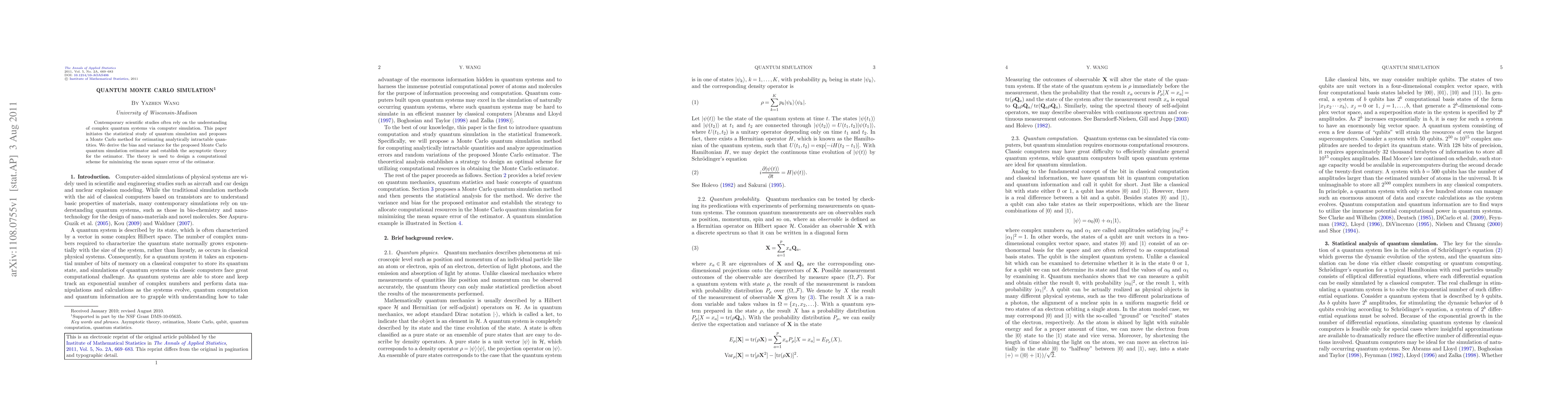 Contemporary scientific studies often rely on the understanding of complex quantum systems via computer simulation. This paper initiates the statistical study of quantum simulation and proposes a Monte Carlo method for estimating analytically intractable quantities. We derive the bias and variance for the proposed Monte Carlo quantum simulation estimator and establish the asymptotic theory for the estimator. The theory is used to design a computational scheme for minimizing the mean square error of the estimator.