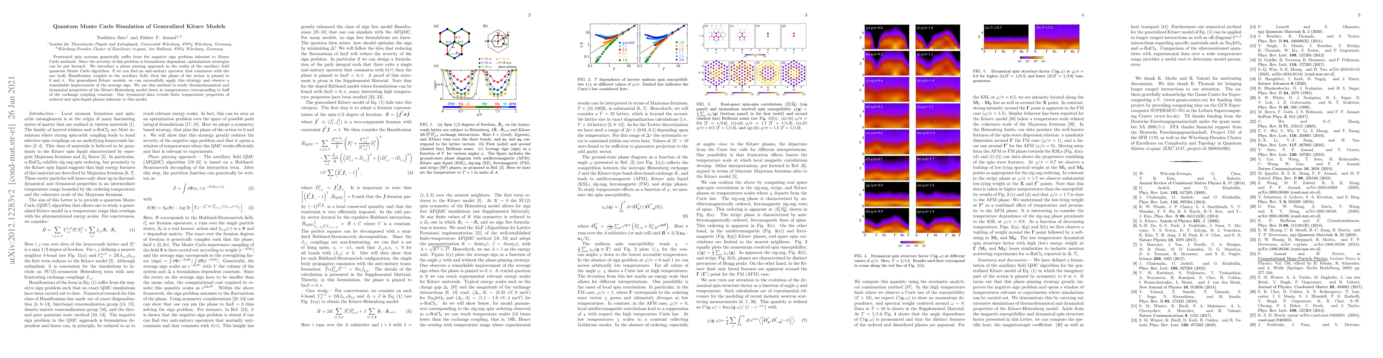 This paper introduces a phase pinning approach within the auxiliary field quantum Monte Carlo algorithm to tackle the sign problem in frustrated spin systems, successfully applying it to generalized Kitaev models. The method significantly improves the average sign, enabling detailed study of thermodynamical and dynamical properties of the Kitaev-Heisenberg model, revealing characteristics of ordered and spin-liquid phases.