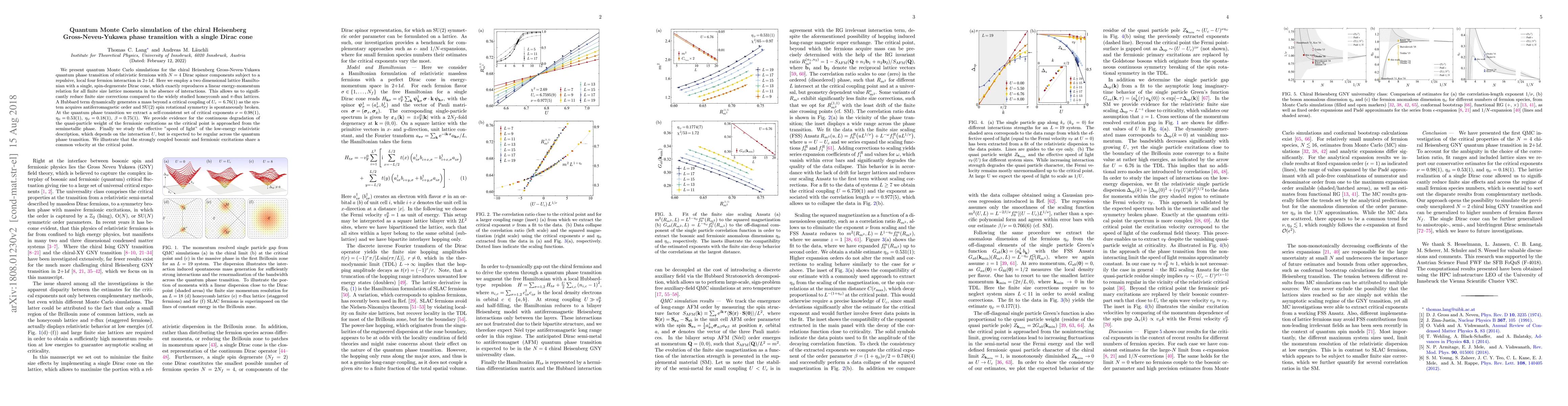 We present quantum Monte Carlo simulations for the chiral Heisenberg Gross-Neveu-Yukawa quantum phase transition of relativistic fermions with $N=4$ Dirac spinor components subject to a repulsive, local four fermion interaction in 2+1$d$. Here we employ a two dimensional lattice Hamiltonian with a single, spin-degenerate Dirac cone, which exactly reproduces a linear energy-momentum relation for all finite size lattice momenta in the absence of interactions. This allows us to significantly reduce finite size corrections compared to the widely studied honeycomb and $\pi$-flux lattices. A Hubbard term dynamically generates a mass beyond a critical coupling of ${U_c = 6.76(1)}$ as the system acquires antiferromagnetic order and SU(2) spin rotational symmetry is spontaneously broken. At the quantum phase transition we extract a self-consistent set of critical exponents ${\nu = 0.98(1)}$, ${\eta_{\phi} = 0.53(1)}$, ${\eta_{\psi} = 0.18(1)}$, ${\beta = 0.75(1)}$. We provide evidence for the continuous degradation of the quasi-particle weight of the fermionic excitations as the critical point is approached from the semimetallic phase. Finally we study the effective "speed of light" of the low-energy relativistic description, which depends on the interaction $U$, but is expected to be regular across the quantum phase transition. We illustrate that the strongly coupled bosonic and fermionic excitations share a common velocity at the critical point.