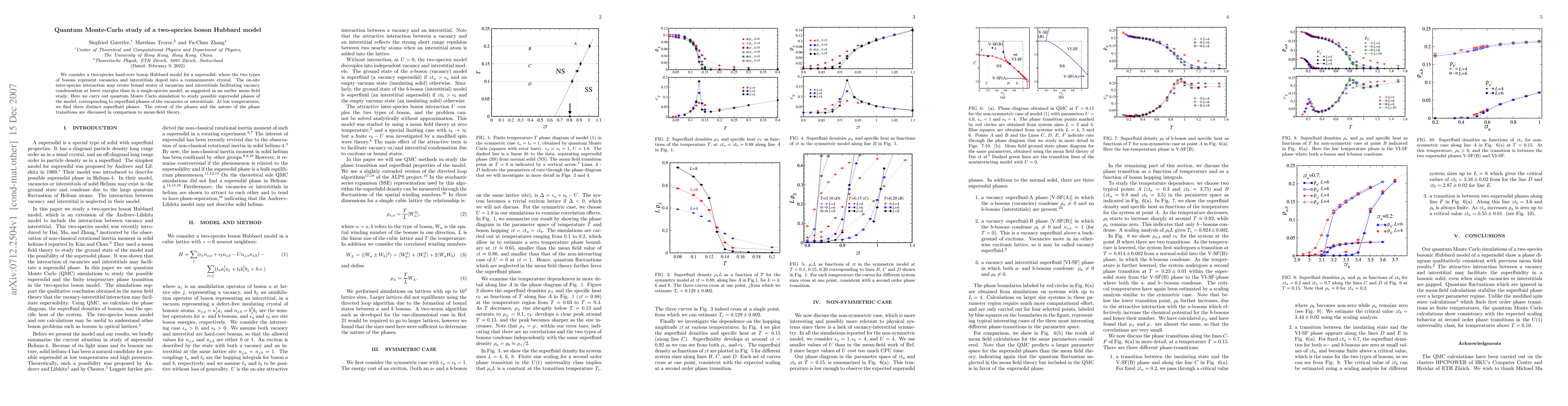 This paper uses quantum Monte Carlo simulations to investigate a two-species boson Hubbard model representing vacancies and interstitials in a supersolid. The study identifies three distinct superfluid phases at low temperatures, comparing the results to earlier mean-field theory predictions.