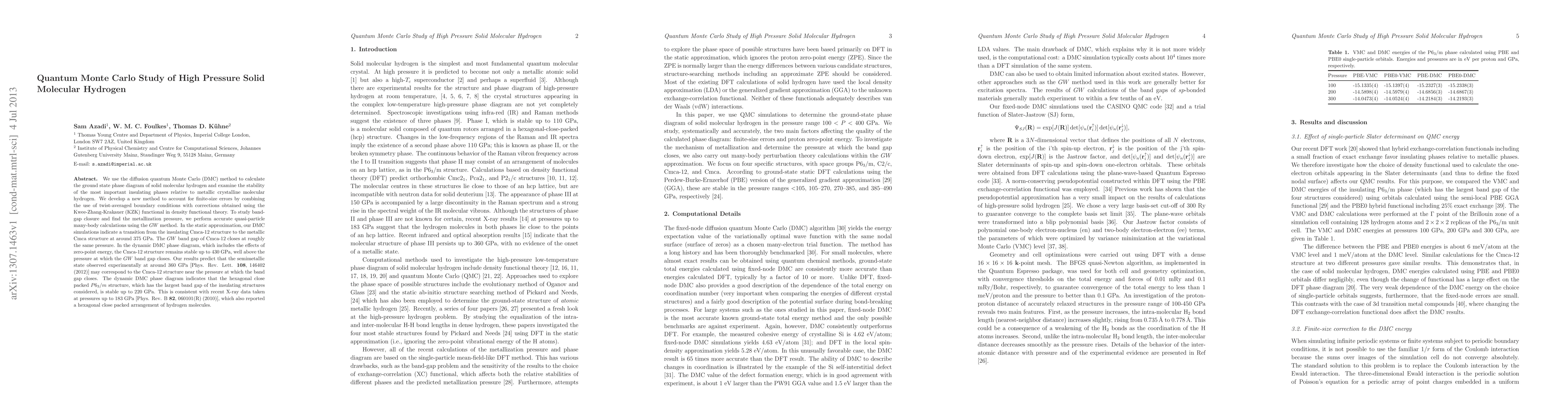 We use the diffusion quantum Monte Carlo (DMC) method to calculate the ground state phase diagram of solid molecular hydrogen and examine the stability of the most important insulating phases relative to metallic crystalline molecular hydrogen. We develop a new method to account for finite-size errors by combining the use of twist-averaged boundary conditions with corrections obtained using the Kwee-Zhang-Krakauer (KZK) functional in density functional theory. To study band-gap closure and find the metallization pressure, we perform accurate quasi-particle many-body calculations using the $GW$ method. In the static approximation, our DMC simulations indicate a transition from the insulating Cmca-12 structure to the metallic Cmca structure at around 375 GPa. The $GW$ band gap of Cmca-12 closes at roughly the same pressure. In the dynamic DMC phase diagram, which includes the effects of zero-point energy, the Cmca-12 structure remains stable up to 430 GPa, well above the pressure at which the $GW$ band gap closes. Our results predict that the semimetallic state observed experimentally at around 360 GPa [Phys. Rev. Lett. {\bf 108}, 146402 (2012)] may correspond to the Cmca-12 structure near the pressure at which the band gap closes. The dynamic DMC phase diagram indicates that the hexagonal close packed $P6_3/m$ structure, which has the largest band gap of the insulating structures considered, is stable up to 220 GPa. This is consistent with recent X-ray data taken at pressures up to 183 GPa [Phys. Rev. B {\bf 82}, 060101(R) (2010)], which also reported a hexagonal close packed arrangement of hydrogen molecules.