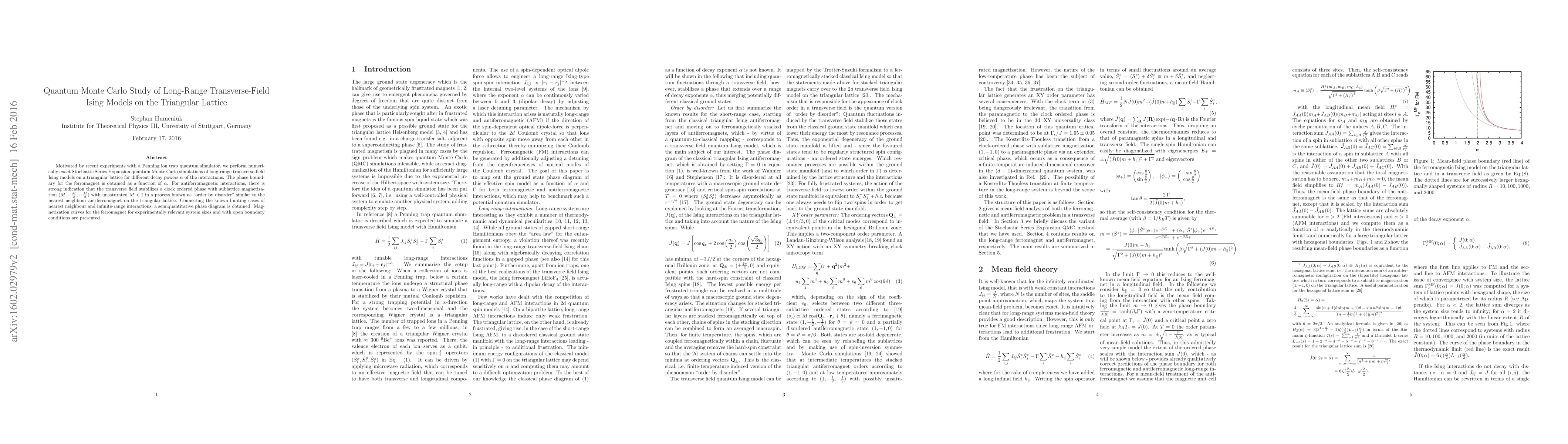 This paper uses Quantum Monte Carlo simulations to study long-range transverse-field Ising models on a triangular lattice, revealing a phase boundary for ferromagnets and indicating the stabilization of a clock ordered phase for antiferromagnetic interactions, akin to "order by disorder." The findings connect the behavior of nearest neighbor and infinite-range interactions, providing a semiquantitative phase diagram.