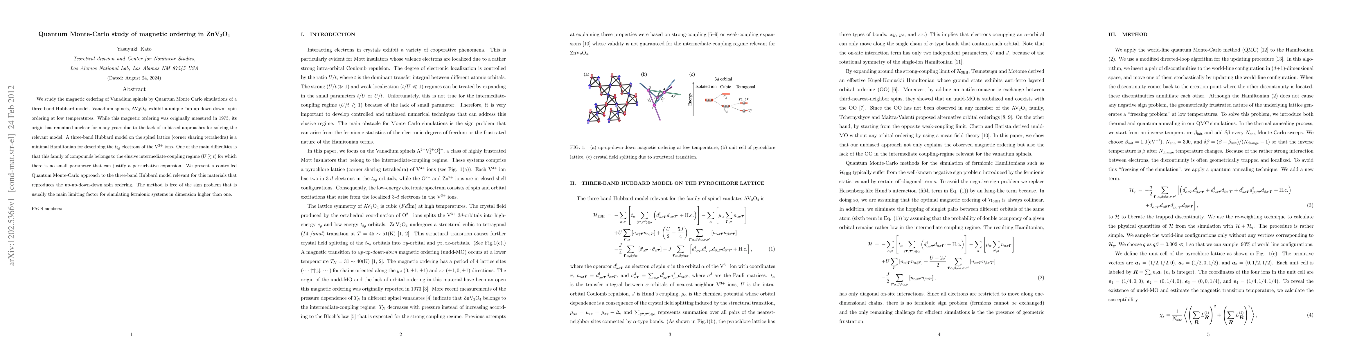 This paper uses Quantum Monte Carlo simulations to study the magnetic ordering in ZnV$_2$O$_4$, revealing its unique "up-up-down-down" spin ordering. The study employs a three-band Hubbard model to describe the $t_{2g}$ electrons of V$^{2+}$ ions, overcoming the challenges of intermediate-coupling regime simulations.