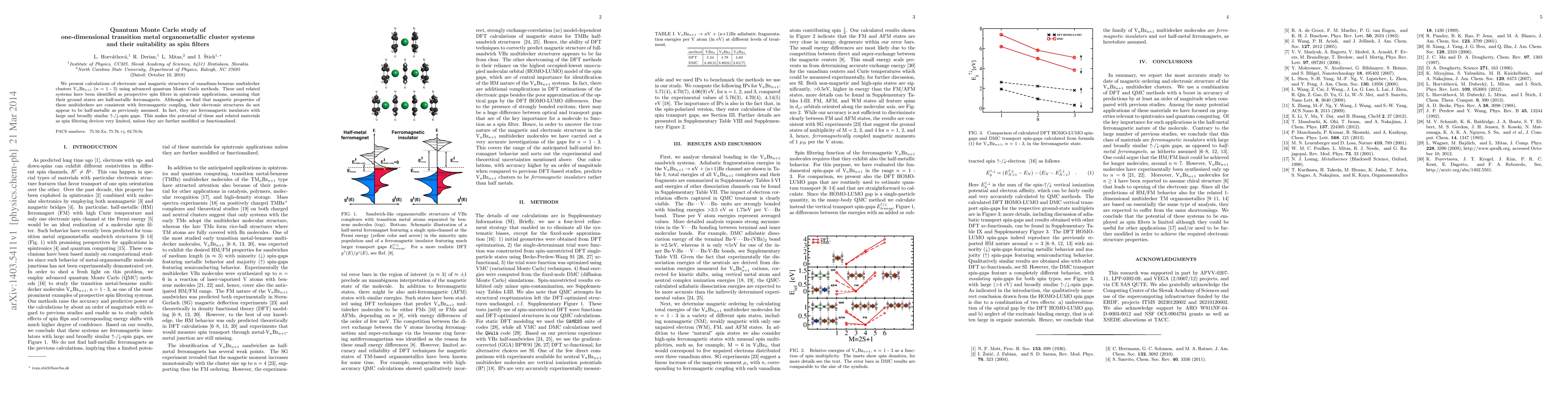 This study uses quantum Monte Carlo methods to investigate the electronic and magnetic structures of vanadium-benzene multidecker clusters, finding they are ferromagnetic insulators rather than half-metallic ferromagnets, thus limiting their potential as spin filters in spintronic applications unless modified.