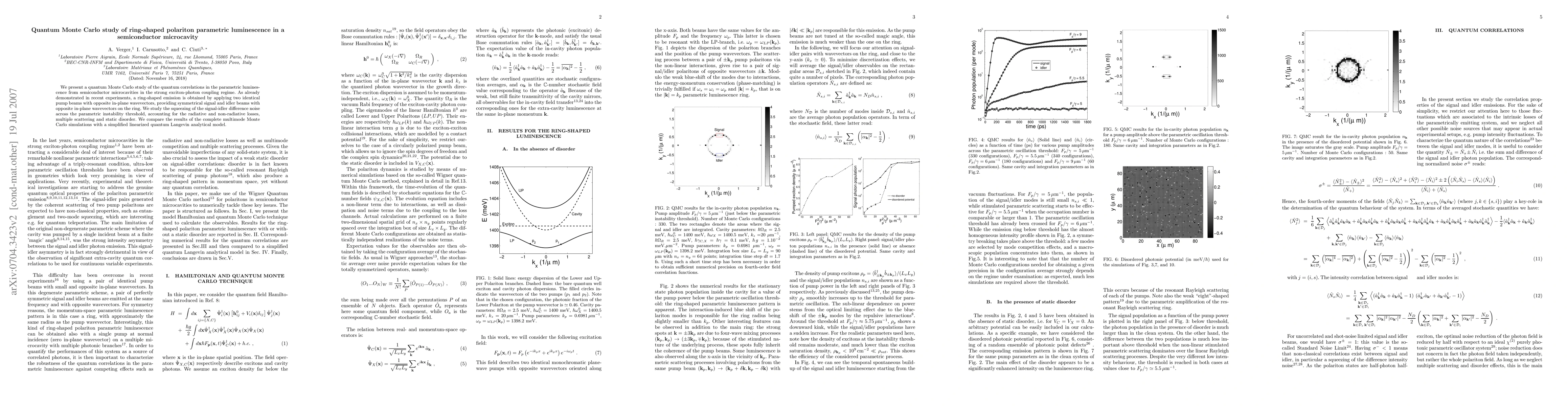 This paper uses quantum Monte Carlo simulations to study quantum correlations in parametric luminescence in semiconductor microcavities, focusing on ring-shaped polariton emission. It examines the squeezing of signal-idler noise and compares simulation results with a simplified analytical model, accounting for various losses and disorder effects.