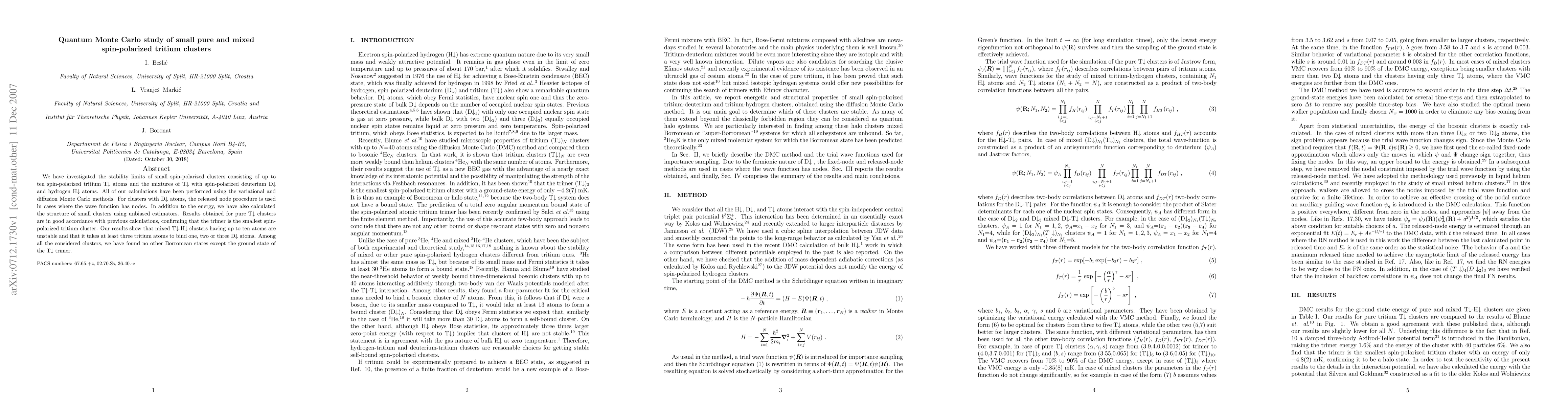 This study uses Quantum Monte Carlo methods to explore the stability of small spin-polarized tritium clusters and their mixtures with deuterium and hydrogen. Results confirm that mixed tritium-hydrogen clusters are unstable, while at least three tritium atoms are needed to bind deuterium atoms, with no other Borromean states found beyond the T$\downarrow$ trimer.
