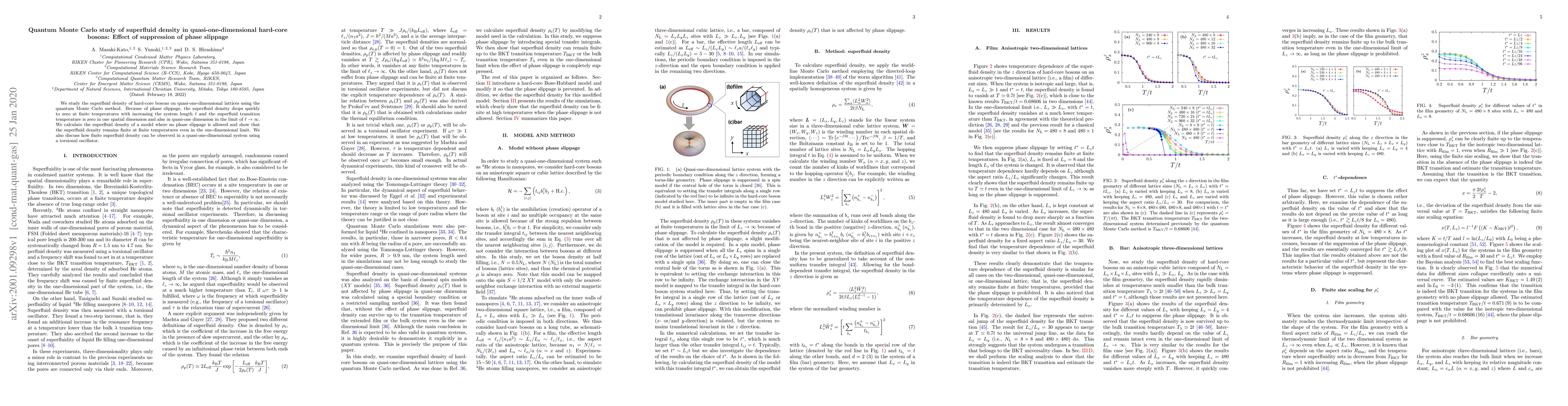 We study the superfluid density of hard-core bosons on quasi-one-dimensional lattices using the quantum Monte Carlo method. Because of phase slippage, the superfluid density drops quickly to zero at finite temperatures with increasing the system length $\ell$ and the superfluid transition temperature is zero in one spatial dimension and also in quasi-one dimension in the limit of $\ell\rightarrow\infty$. We calculate the superfluid density of a model where no phase slippage is allowed and show that the superfluid density remains finite at finite temperatures even in the one-dimensional limit. We also discuss how finite superfluid density can be observed in a quasi-one-dimensional system using a torsional oscillator.