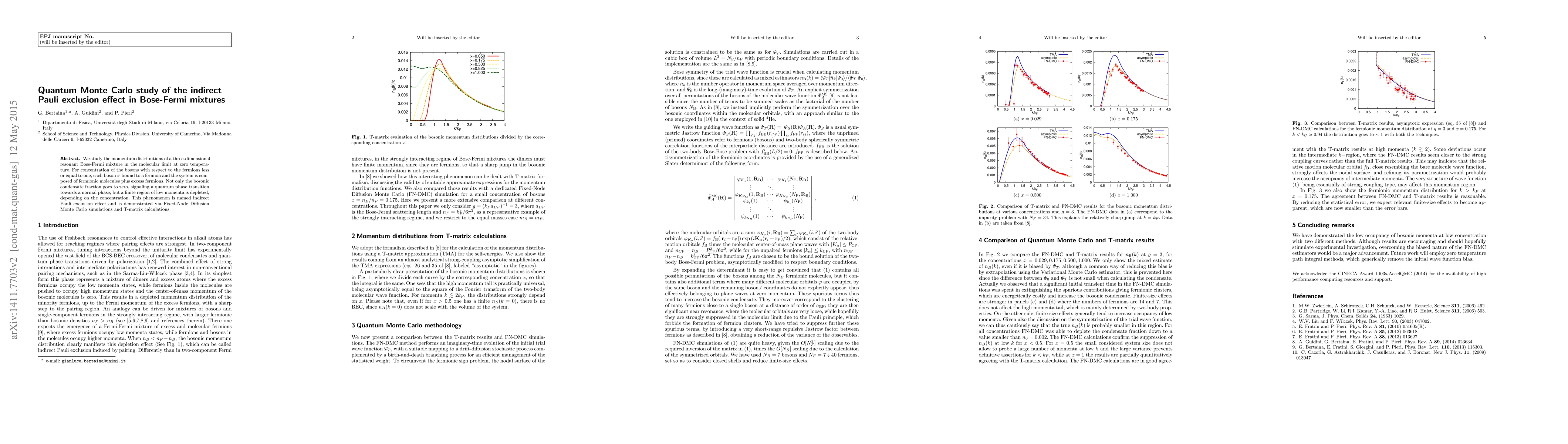 Researchers studied a mixture of bosons and fermions in a quantum system, finding that at low concentrations, a region of low momenta is depleted due to the indirect Pauli exclusion effect, leading to a phase transition towards a normal state. This phenomenon was observed via Monte Carlo simulations and T-matrix calculations.