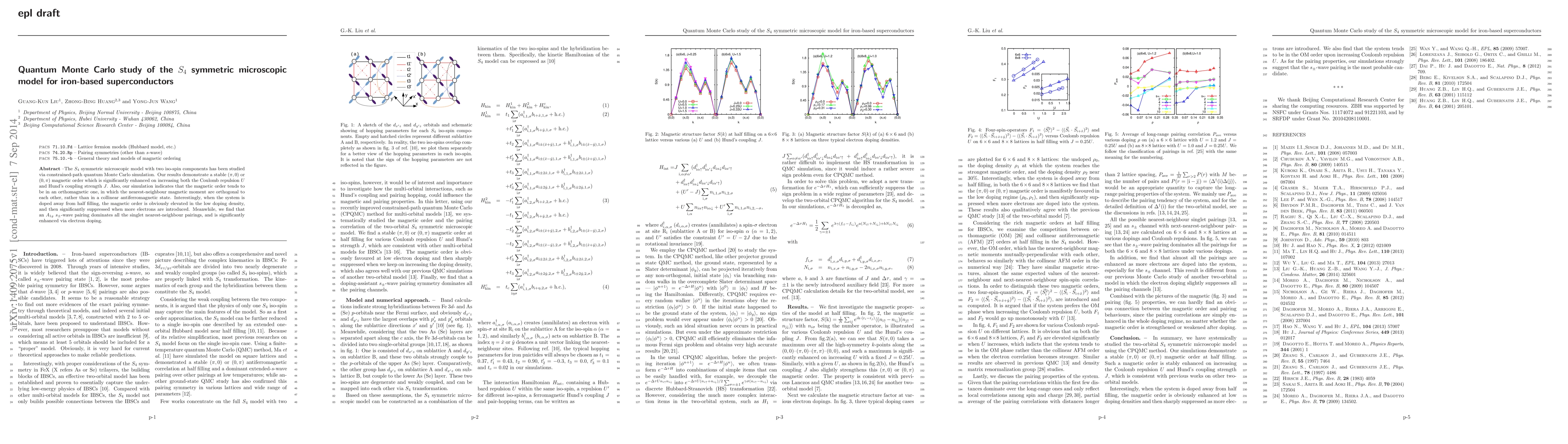 The $S_4$ symmetric microscopic model with two iso-spin components has been studied via constrained-path quantum Monte Carlo simulation. Our results demonstrate a stable $(\pi,0)$ or $(0,\pi)$ magnetic order which is significantly enhanced on increasing both the Coulomb repulsion $U$ and Hund's coupling strength $J$. Also, our simulation indicates that the magnetic order tends to be in an orthomagnetic one, in which the nearest-neighbour magnetic moment are orthogonal to each other, rather than in a collinear antiferromagnetic state. Interestingly, when the system is doped away from half filling, the magnetic order is obviously elevated in the low doping density, and then significantly suppressed when more electrons are introduced. Meanwhile, we find that an $A_{1g}$ $s_{\pm}$-wave pairing dominates all the singlet nearest-neighbour pairings, and is significantly enhanced via electron doping.