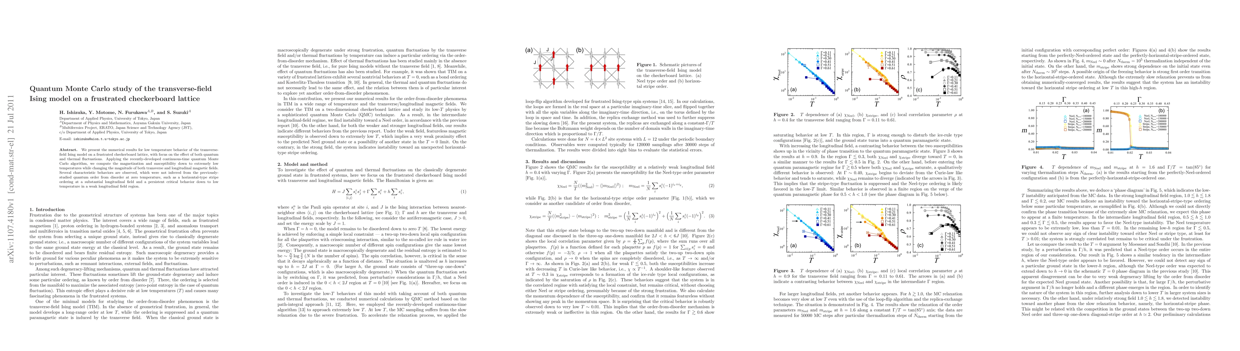 This paper uses a continuous-time quantum Monte Carlo algorithm to study the transverse-field Ising model on a frustrated checkerboard lattice, revealing new low-temperature behaviors such as horizontal-type stripe ordering and persistent critical behavior, not previously observed in quantum order from disorder studies.