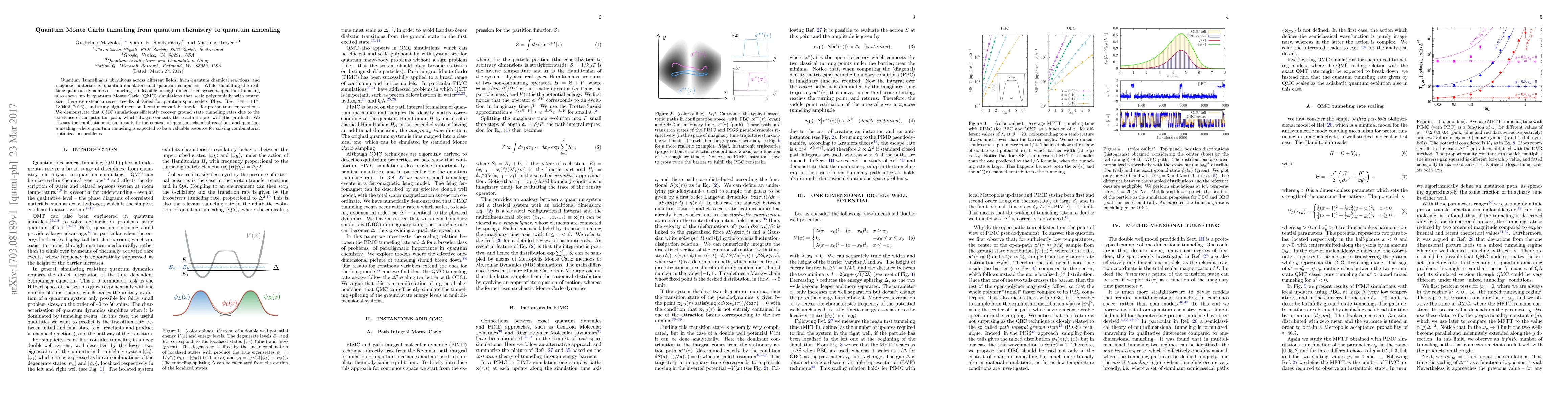 This paper explores quantum tunneling in quantum Monte Carlo (QMC) simulations for high-dimensional continuous variable models, demonstrating efficient recovery of ground state tunneling rates. The findings suggest that QMC simulations can leverage instanton paths for proton transfer reactions, with implications for quantum chemistry and quantum annealing in solving optimization problems.