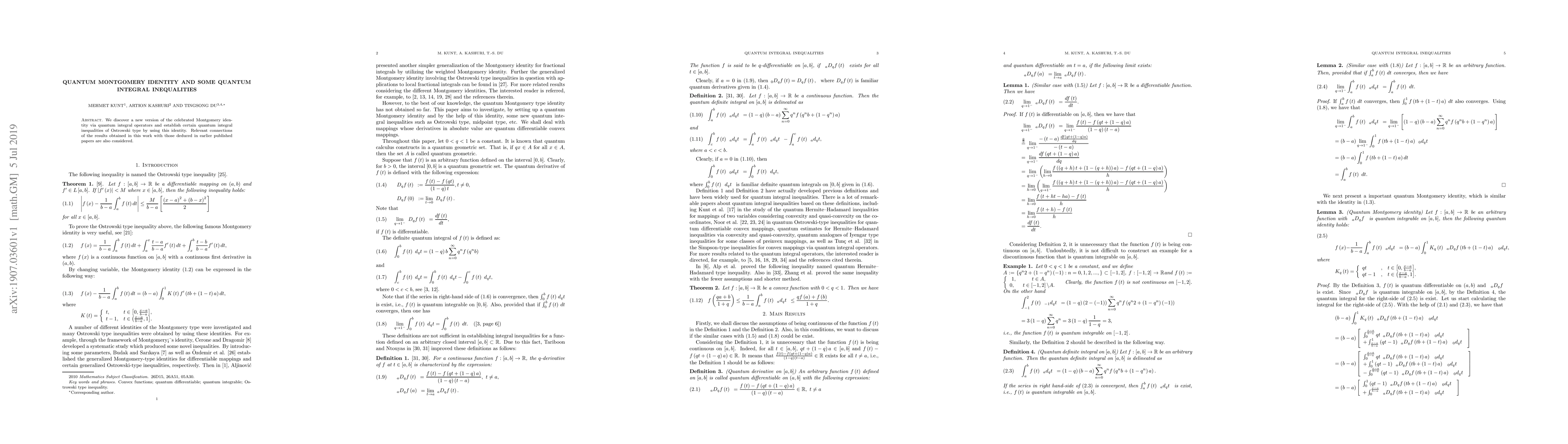 This paper introduces a new quantum version of the Montgomery identity through quantum integral operators and derives quantum integral inequalities of the Ostrowski type using this identity. It also discusses connections between the new results and previously published findings.