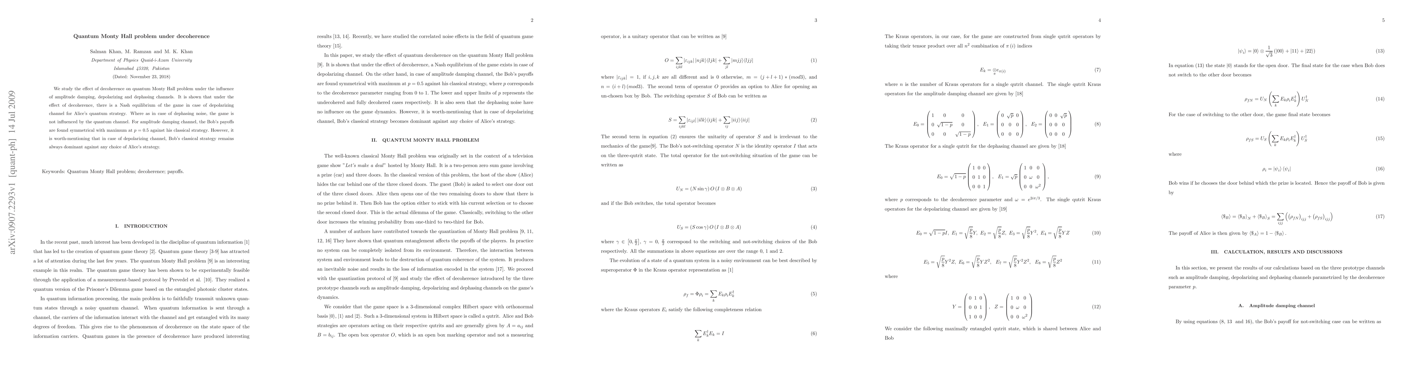 This paper investigates the quantum Monty Hall problem under various decoherence channels, revealing that depolarizing channel leads to a Nash equilibrium for Alice's quantum strategy, while dephasing noise does not affect the game. Amplitude damping results in symmetrical payoffs for Bob at p=0.5, but Bob's classical strategy remains superior against Alice's quantum strategy in the depolarizing channel.