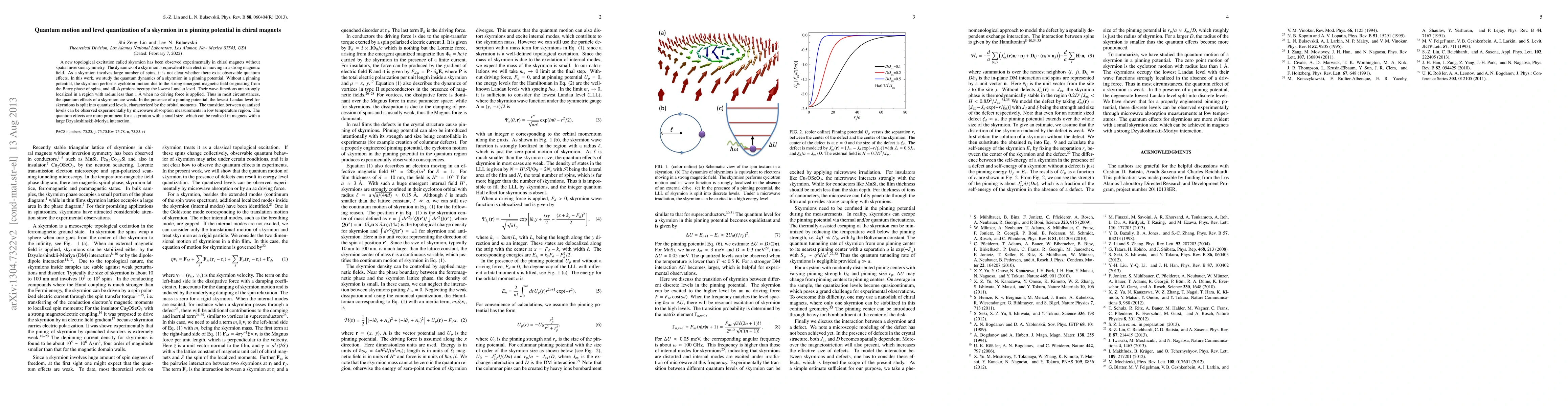 A new topological excitation called skyrmion has been observed experimentally in chiral magnets without spatial inversion symmetry. The dynamics of a skyrmion is equivalent to an electron moving in a strong magnetic field. As a skyrmion involves large number of spins, it is not clear whether there exist observable quantum effects. In this work, we study the quantum dynamics of a skyrmion in a pinning potential. Without a pinning potential, the skyrmion performs cyclotron motion due to the strong emergent magnetic field originating from the Berry phase of spins, and all skyrmions occupy the lowest Landau level. Their wave functions are strongly localized in a region with radius less than $1\ \AA$ when no driving force is applied. Thus in most circumstances, the quantum effects of a skyrmion are weak. In the presence of a pinning potential, the lowest Landau level for skyrmions is split into quantized levels, characterized by the orbital moments. The transition between quantized levels can be observed experimentally by microwave absorption measurements in low temperature region. The quantum effects are more prominent for a skyrmion with a small size, which can be realized in magnets with a large Dzyaloshinskii-Moriya interaction.