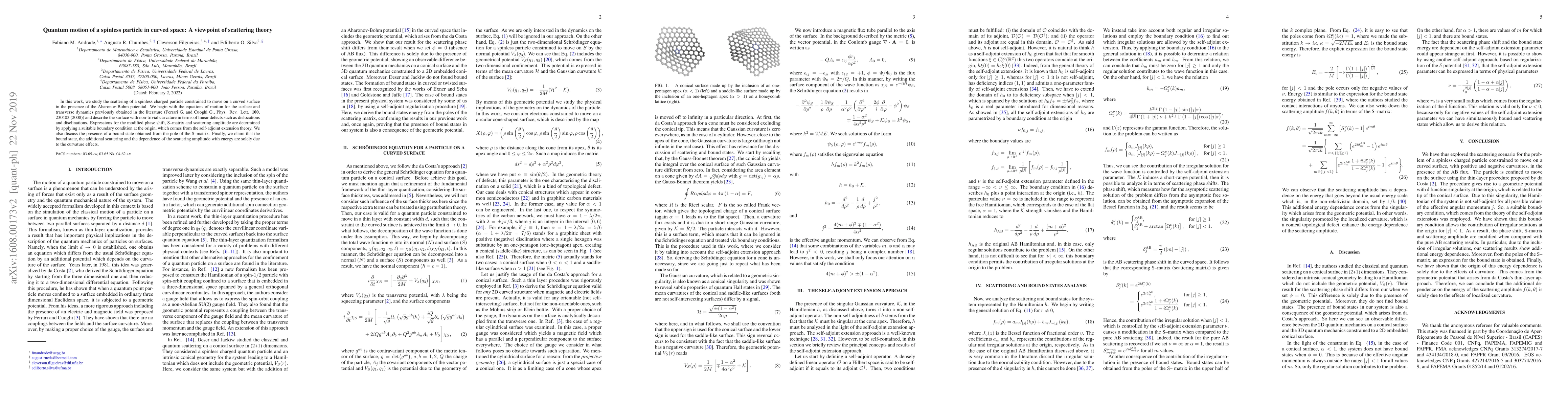 In this work, we study the scattering of a spinless charged particle constrained to move on a curved surface in the presence of the Aharonov-Bohm potential. We begin with the equations of motion for the surface and transverse dynamics previously obtained in the literature (Ferrari G. and Cuoghi G., Phys. Rev. Lett. \textbf{100}, 230403 (2008)) and describe the surface with non-trivial curvature in terms of linear defects such as dislocations and disclinations. Expressions for the modified phase shift, S--matrix and scattering amplitude are determined by applying a suitable boundary condition at the origin, which comes from the self-adjoint extension theory. We also discuss the presence of a bound state obtained from the pole of the S--matrix. Finally, we claim that the bound state, the additional scattering and the dependence of the scattering amplitude with energy are solely due to the curvature effects.