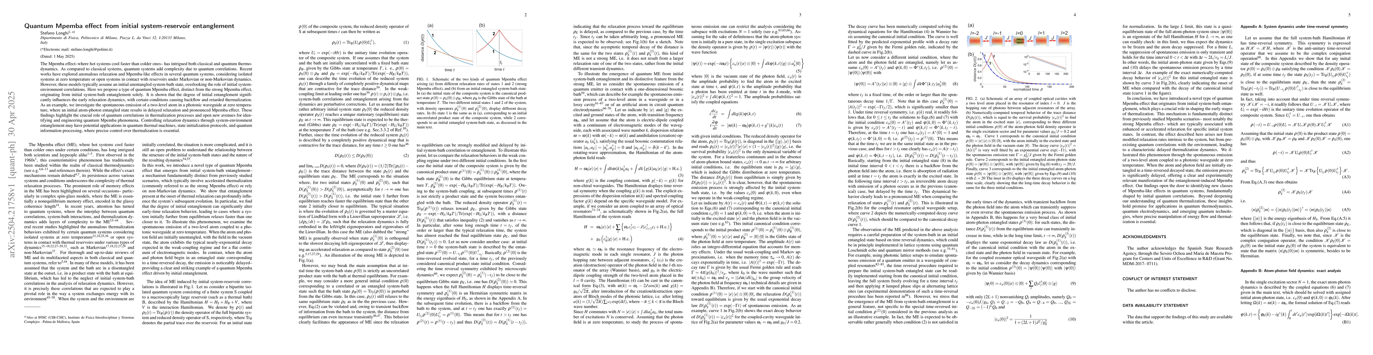 The research proposes a quantum Mpemba effect originating from initial system-bath entanglement, demonstrated through the spontaneous emission of a two-level atom in a photonic waveguide at zero temperature.
