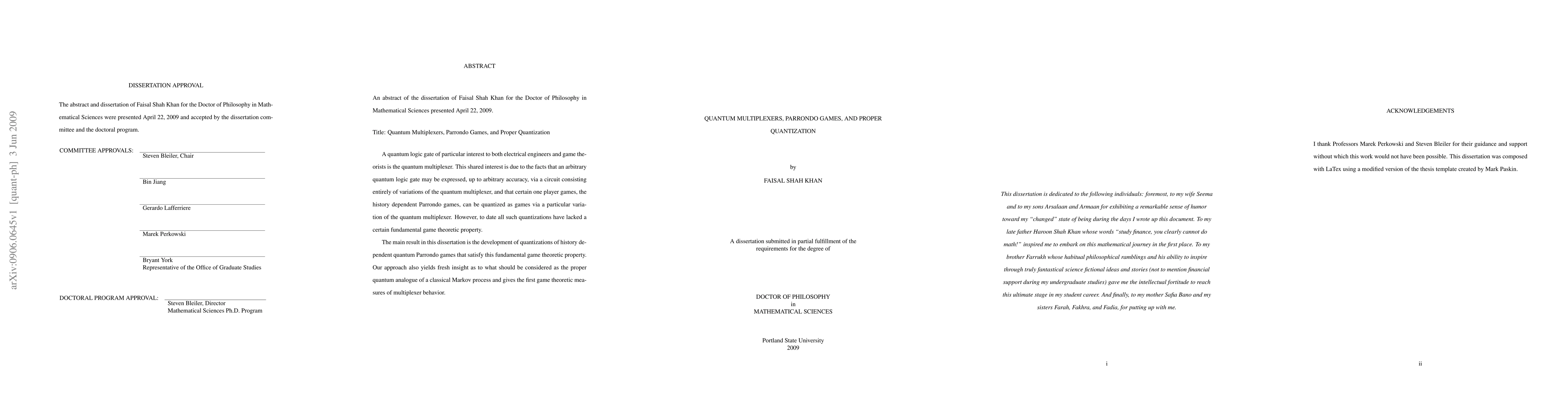 A quantum logic gate of particular interest to both electrical engineers and game theorists is the quantum multiplexer. This shared interest is due to the facts that an arbitrary quantum logic gate may be expressed, up to arbitrary accuracy, via a circuit consisting entirely of variations of the quantum multiplexer, and that certain one player games, the history dependent Parrondo games, can be quantized as games via a particular variation of the quantum multiplexer. However, to date all such quantizations have lacked a certain fundamental game theoretic property. The main result in this dissertation is the development of quantizations of history dependent quantum Parrondo games that satisfy this fundamental game theoretic property. Our approach also yields fresh insight as to what should be considered as the proper quantum analogue of a classical Markov process and gives the first game theoretic measures of multiplexer behavior.