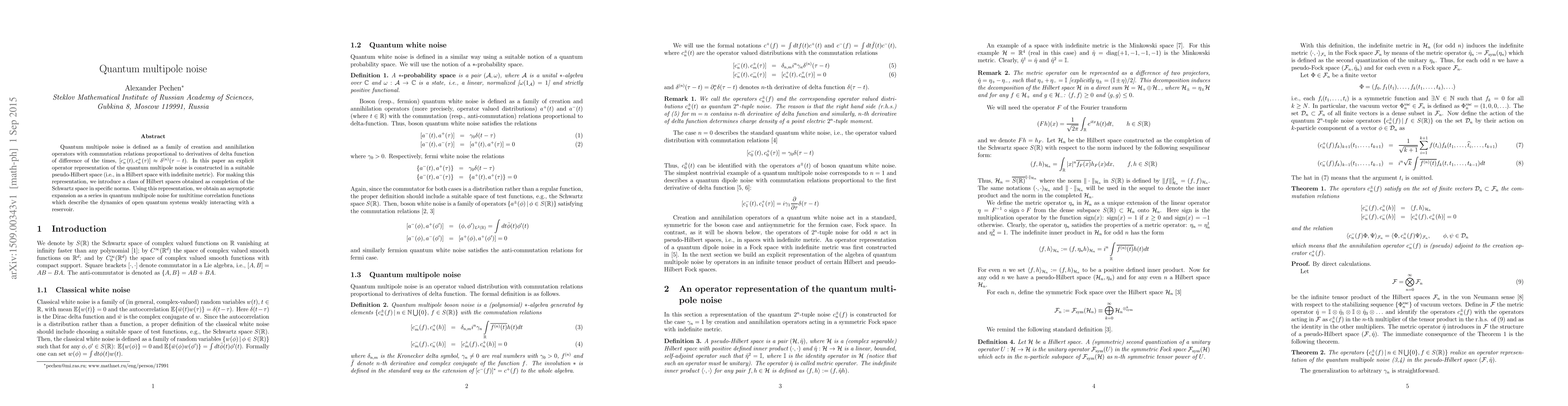 Quantum multipole noise is defined as a family of creation and annihilation operators with commutation relations proportional to derivatives of delta function of difference of the times, $[c^-_n(t),c^+_n(\tau)]\approx \delta^{(n)}(\tau-t)$. In this paper an explicit operator representation of the quantum multipole noise is constructed in a suitable pseudo-Hilbert space (i.e., in a Hilbert space with indefinite metric). For making this representation, we introduce a class of Hilbert spaces obtained as completion of the Schwartz space in specific norms. Using this representation, we obtain an asymptotic expansion as a series in quantum multipole noise for multitime correlation functions which describe the dynamics of open quantum systems weakly interacting with a reservoir.