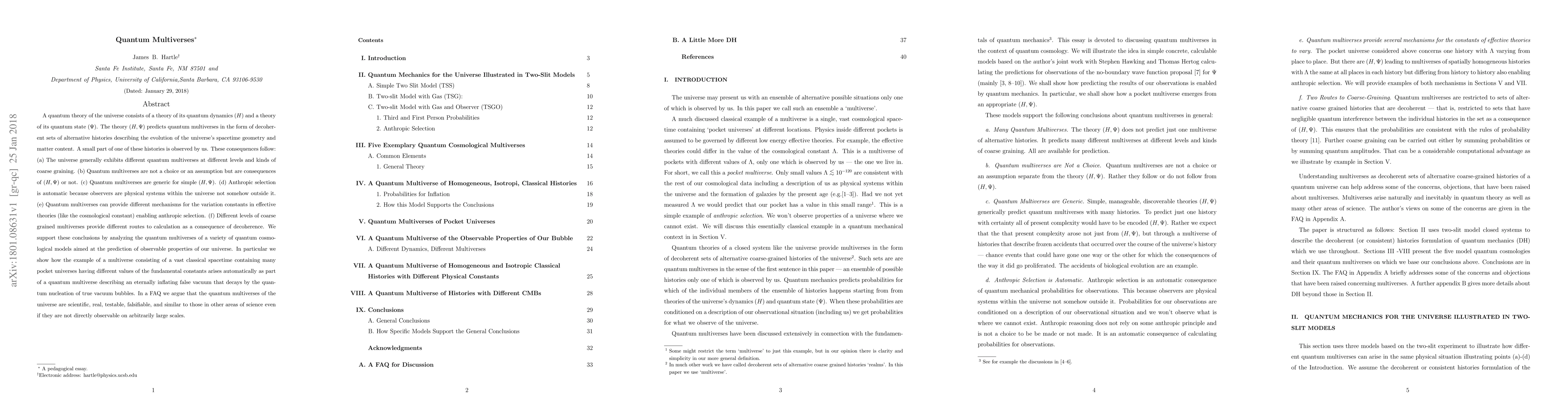 A quantum theory of the universe consists of a theory of its quantum dynamics and a theory of its quantum state The theory predicts quantum multiverses in the form of decoherent sets of alternative histories describing the evolution of the universe's spacetime geometry and matter content. These consequences follow: (a) The universe generally exhibits different quantum multiverses at different levels and kinds of coarse graining. (b) Quantum multiverses are not a choice or an assumption but are consequences of the theory or not. (c) Quantum multiverses are generic for simple theories (d) Anthropic selection is automatic because observers are physical systems within the universe not somehow outside it. (e) Quantum multiverses can provide different mechanisms for the variation constants in effective theories (like the cosmological constant) enabling anthropic selection. (f) Different levels of coarse grained multiverses provide different routes to calculation as a consequence of decoherence. We support these conclusions by analyzing the quantum multiverses of a variety of quantum cosmological models aimed at the prediction of observable properties of our universe. In particular we show how the example of a multiverse consisting of a vast classical spacetime containing many pocket universes arises automatically as part of a quantum multiverse describing an eternally inflating false vacuum that decays by the quantum nucleation of true vacuum bubbles. In a FAQ we argue that the quantum multiverses of the universe are scientific, real, testable, falsifiable, and similar to those in other areas of science even if they are not directly observable on arbitrarily large scales.