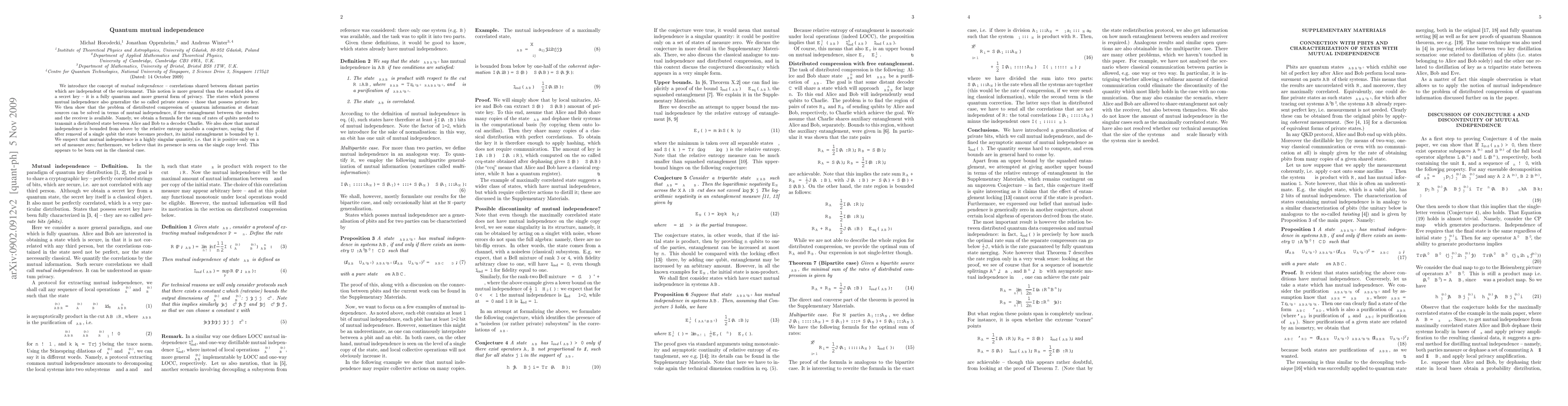 We introduce the concept of mutual independence -- correlations shared between distant parties which are independent of the environment. This notion is more general than the standard idea of a secret key -- it is a fully quantum and more general form of privacy. The states which possess mutual independence also generalize the so called private states -- those that possess private key. We then show that the problem of distributed compression of quantum information at distant sources can be solved in terms of mutual independence, if free entanglement between the senders and the receiver is available. Namely, we obtain a formula for the sum of rates of qubits needed to transmit a distributed state between Alice and Bob to a decoder Charlie. We also show that mutual independence is bounded from above by the relative entropy modulo a conjecture, saying that if after removal of a single qubit the state becomes product, its initial entanglement is bounded by 1. We suspect that mutual independence is a highly singular quantity, i.e. that it is positive only on a set of measure zero; furthermore, we believe that its presence is seen on the single copy level. This appears to be born out in the classical case.