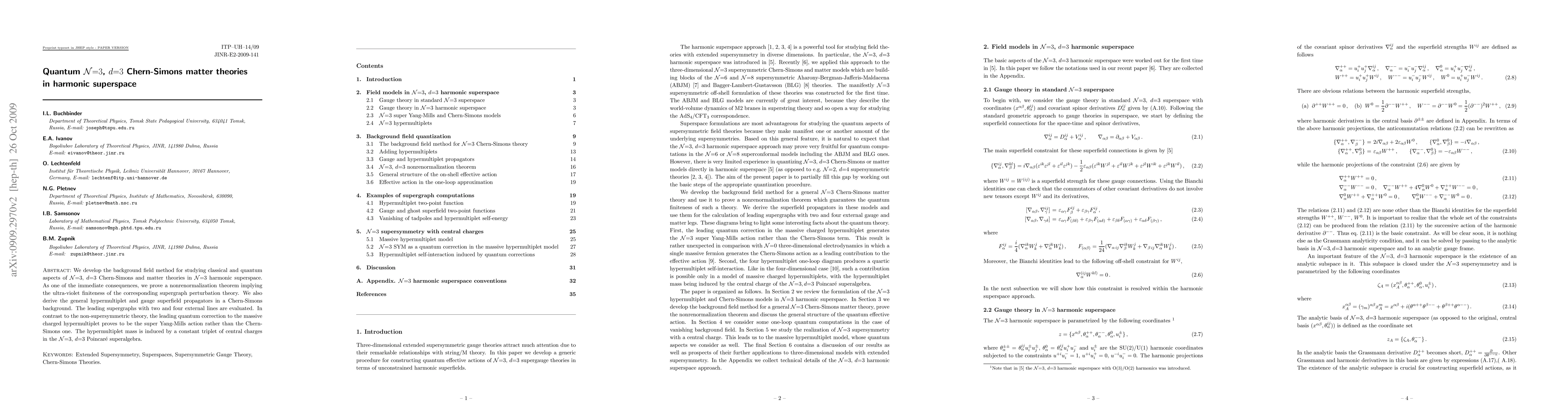This paper develops the background field method to study N=3, d=3 Chern-Simons and matter theories in harmonic superspace, proving a nonrenormalization theorem for ultra-violet finiteness. It evaluates leading supergraphs and finds that quantum corrections lead to a super Yang-Mills action instead of the Chern-Simons one, with hypermultiplet mass induced by central charges.
