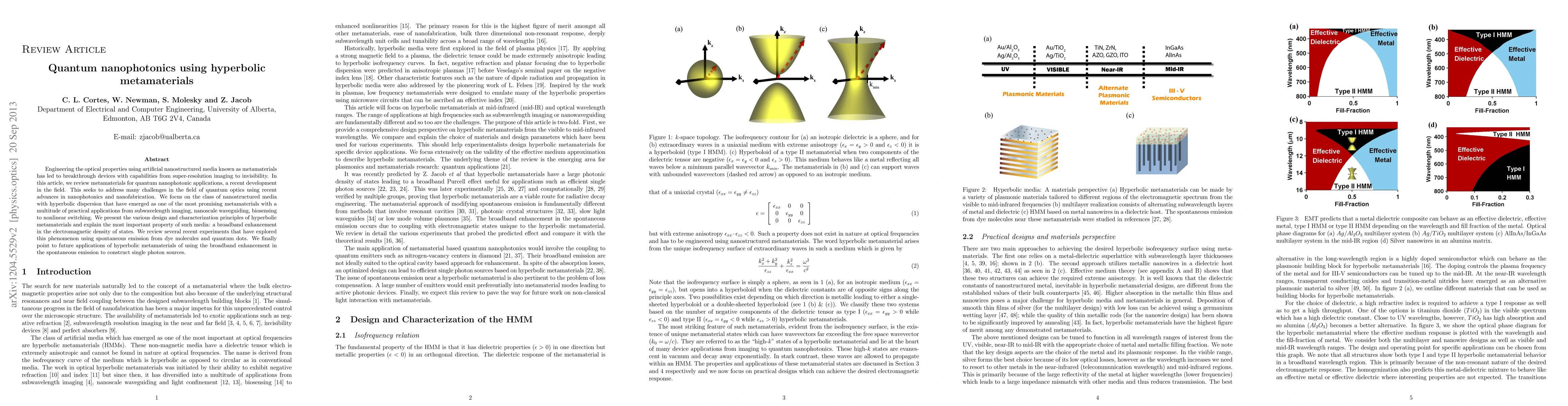 This paper reviews the use of hyperbolic metamaterials in quantum nanophotonics, highlighting their potential for subwavelength imaging, nanoscale waveguiding, and biosensing due to their broadband enhancement in electromagnetic density of states. It discusses recent experiments and future prospects for constructing single photon sources.