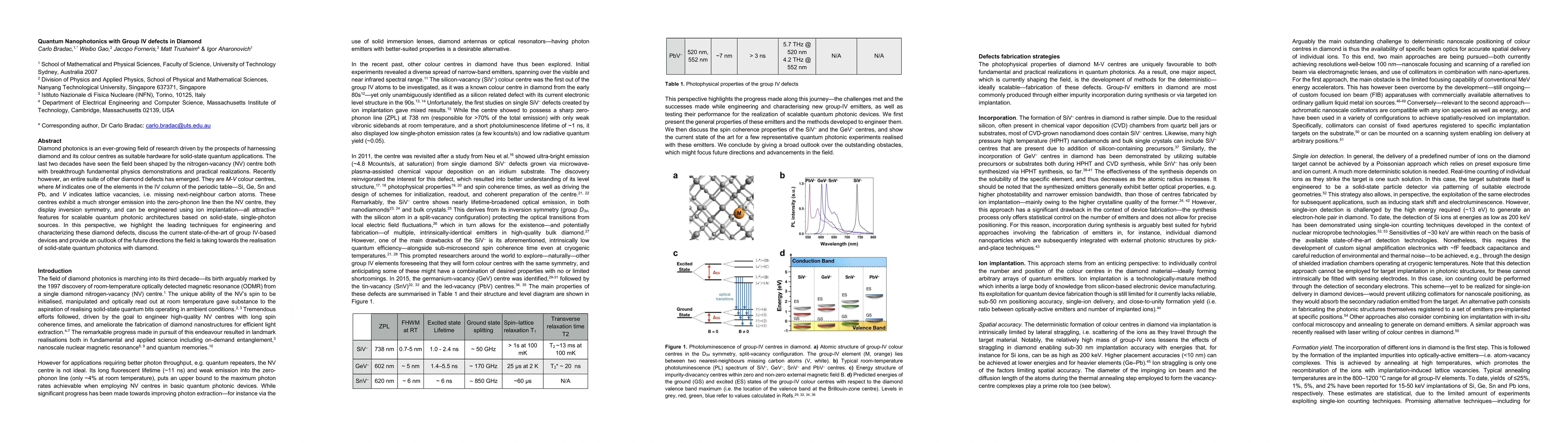 Diamond photonics is an ever growing field of research driven by the prospects of harnessing diamond and its colour centres as suitable hardware for solid-state quantum applications. The last two decades have seen the field been shaped by the nitrogen-vacancy (NV) centre both with breakthrough fundamental physics demonstrations and practical realizations. Recently however, an entire suite of other diamond defects has emerged. They are M V colour centres, where M indicates one of the elements in the IV column of the periodic table Si, Ge, Sn and Pb, and V indicates lattice vacancies, i.e. missing next-neighbour carbon atoms. These centres exhibit a much stronger emission into the zero phonon line then the NV centre, they display inversion symmetry, and can be engineered using ion implantation all attractive features for scalable quantum photonic architectures based on solid-state, single-photon sources. In this perspective, we highlight the leading techniques for engineering and characterizing these diamond defects, discuss the current state-of-the-art of group IV-based devices and provide an outlook of the future directions the field is taking towards the realisation of solid-state quantum photonics with diamond.