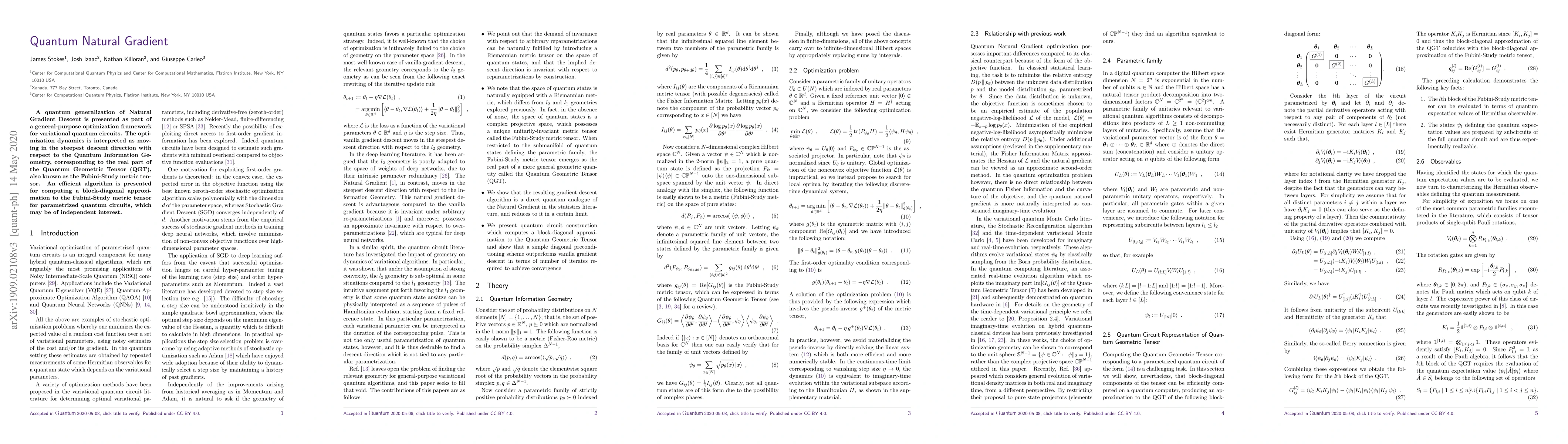 Summary: This paper introduces a quantum version of Natural Gradient Descent for optimizing variational quantum circuits, utilizing the Quantum Geometric Tensor for steepest descent. It also presents an efficient algorithm for computing an approximation of the Fubini-Study metric tensor.