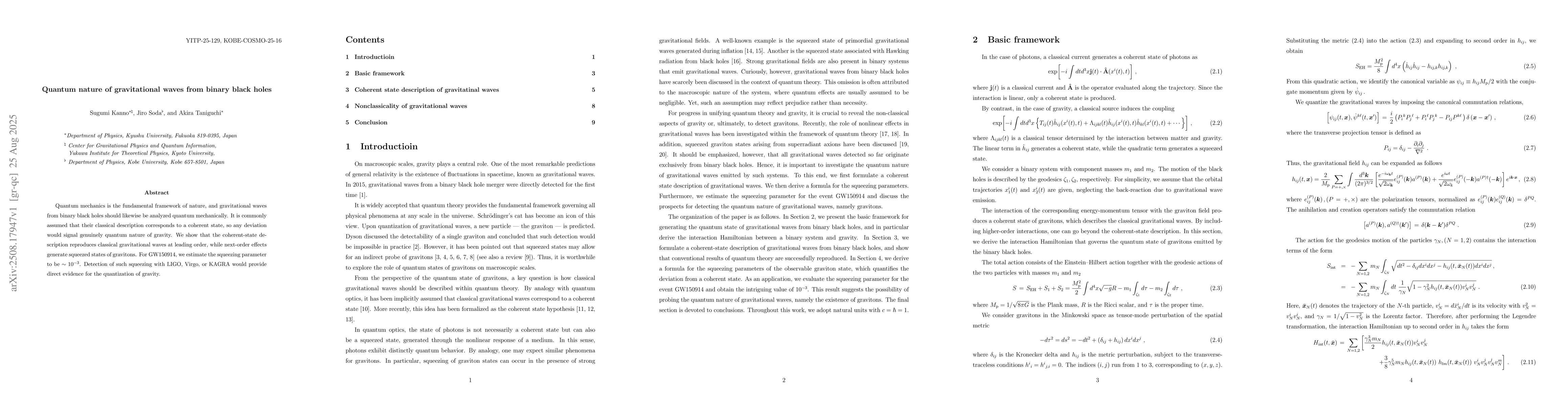 Quantum mechanics is the fundamental framework of nature, and gravitational waves from binary black holes should likewise be analyzed quantum mechanically. It is commonly assumed that their classical description corresponds to a coherent state, so any deviation would signal genuinely quantum nature of gravity. We show that the coherent-state description reproduces classical gravitational waves at leading order, while next-order effects generate squeezed states of gravitons. For GW150914, we estimate the squeezing parameter to be $\sim 10^{-3}$. Detection of such squeezing with LIGO, Virgo, or KAGRA would provide direct evidence for the quantization of gravity.