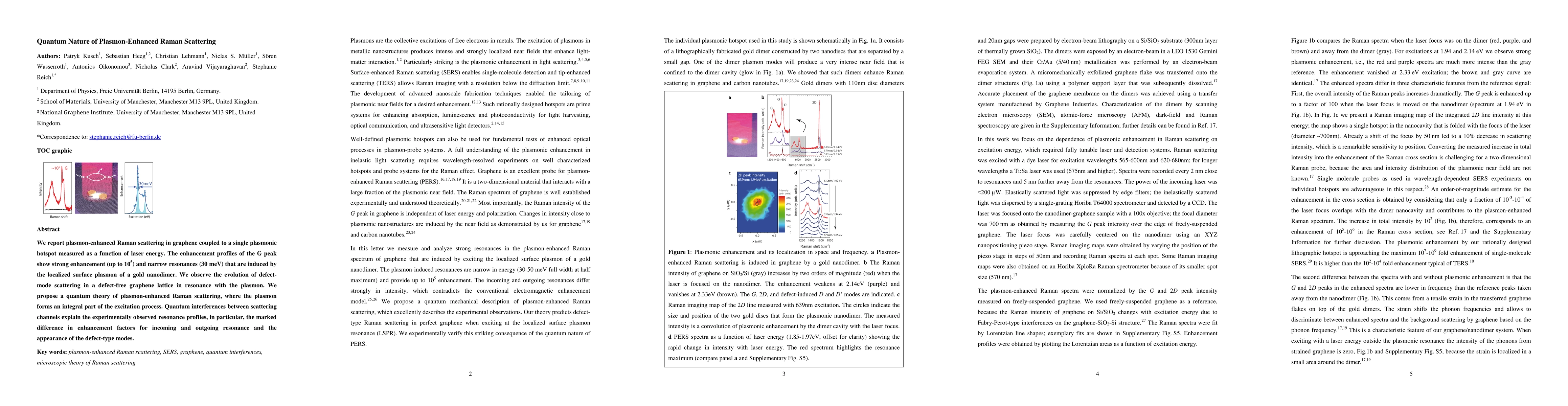 This study reveals significant plasmon-enhanced Raman scattering in graphene linked to a gold nanodimer, showing strong enhancement and narrow resonances due to localized surface plasmons. A proposed quantum theory explains the resonance profiles through quantum interferences, highlighting the integral role of plasmons in the excitation process.