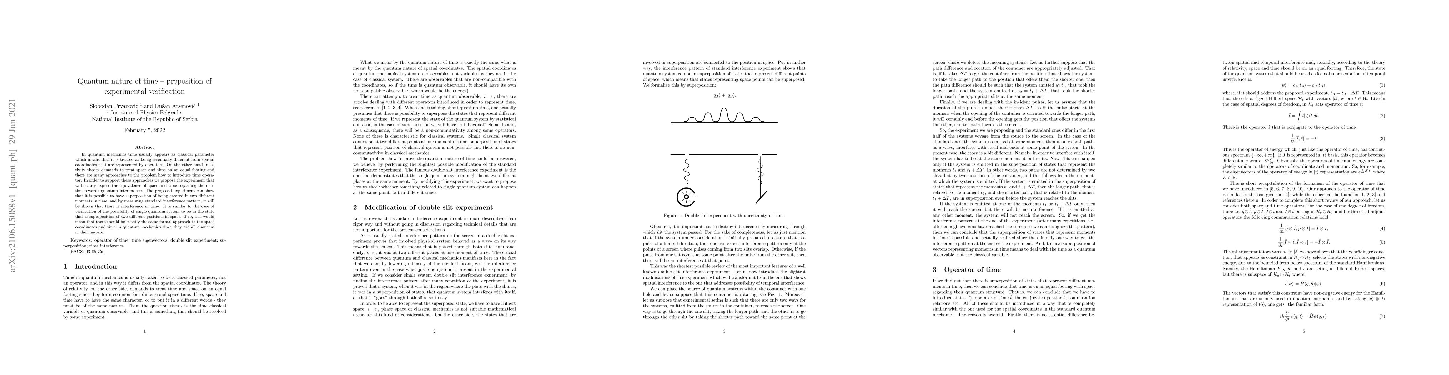 In quantum mechanics time usually appears as classical parameter which means that it is treated as being essentially different from spatial coordinates that are represented by operators. On the other hand, relativity theory demands to treat space and time on an equal footing and there are many approaches to the problem how to introduce time operator. In order to support these approaches we propose the experiment that will clearly expose the equivalence of space and time regarding the relation towards quantum interference. The proposed experiment can show that it is possible to have superposition of being created in two different moments in time, and by measuring standard interference pattern, it will be shown that there is interference in time. It is similar to the case of verification of the possibility of single quantum system to be in the state that is superposition of two different positions in space. If so, this would mean that there should be exactly the same formal approach to the space coordinates and time in quantum mechanics since they are all quantum in their nature.