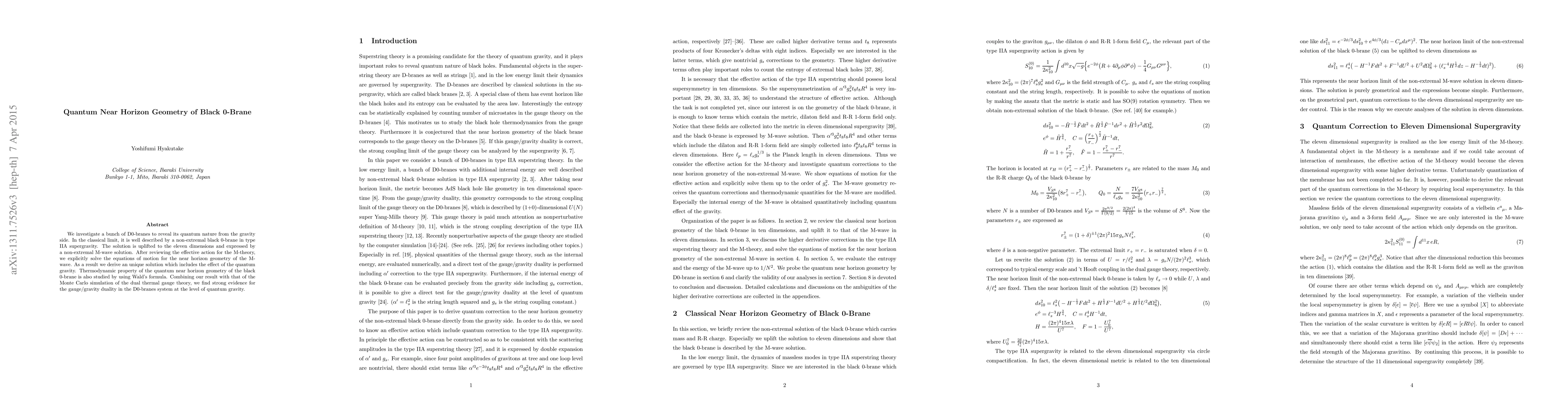 We investigate a bunch of D0-branes to reveal its quantum nature from the gravity side. In the classical limit, it is well described by a non-extremal black 0-brane in type IIA supergravity. The solution is uplifted to the eleven dimensions and expressed by a non-extremal M-wave solution. After reviewing the effective action for the M-theory, we explicitly solve the equations of motion for the near horizon geometry of the M-wave. As a result we derive an unique solution which includes the effect of the quantum gravity. Thermodynamic property of the quantum near horizon geometry of the black 0-brane is also studied by using Wald's formula. Combining our result with that of the Monte Carlo simulation of the dual thermal gauge theory, we find strong evidence for the gauge/gravity duality in the D0-branes system at the level of quantum gravity.