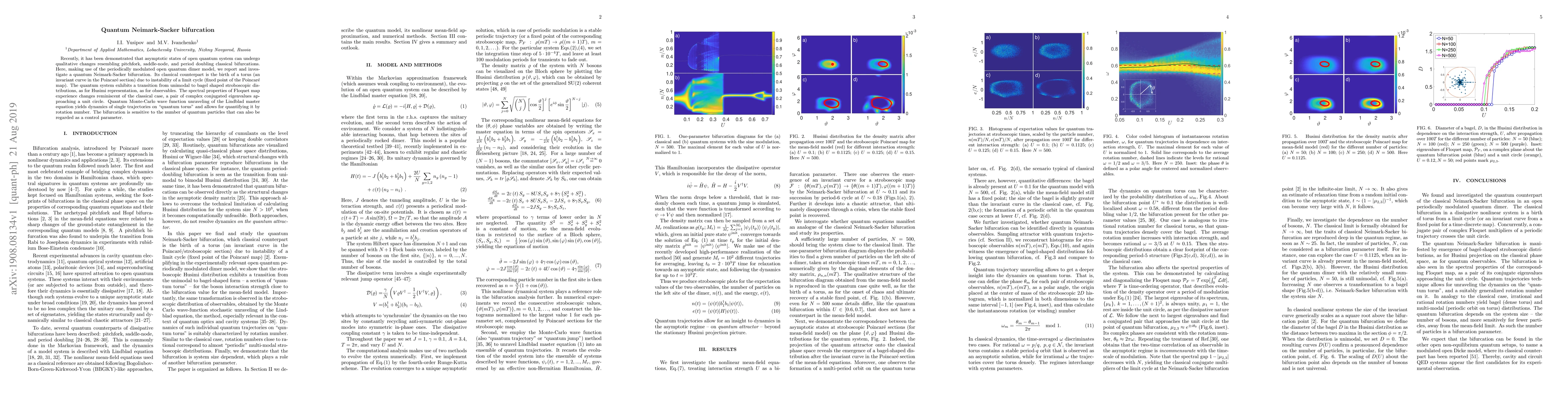 This paper investigates a quantum Neimark-Sacker bifurcation in an open quantum dimer model, revealing a transition from unimodal to bagel-shaped stroboscopic distributions. The study quantifies the dynamics using the rotation number on a "quantum torus" and highlights the bifurcation's sensitivity to the number of quantum particles.