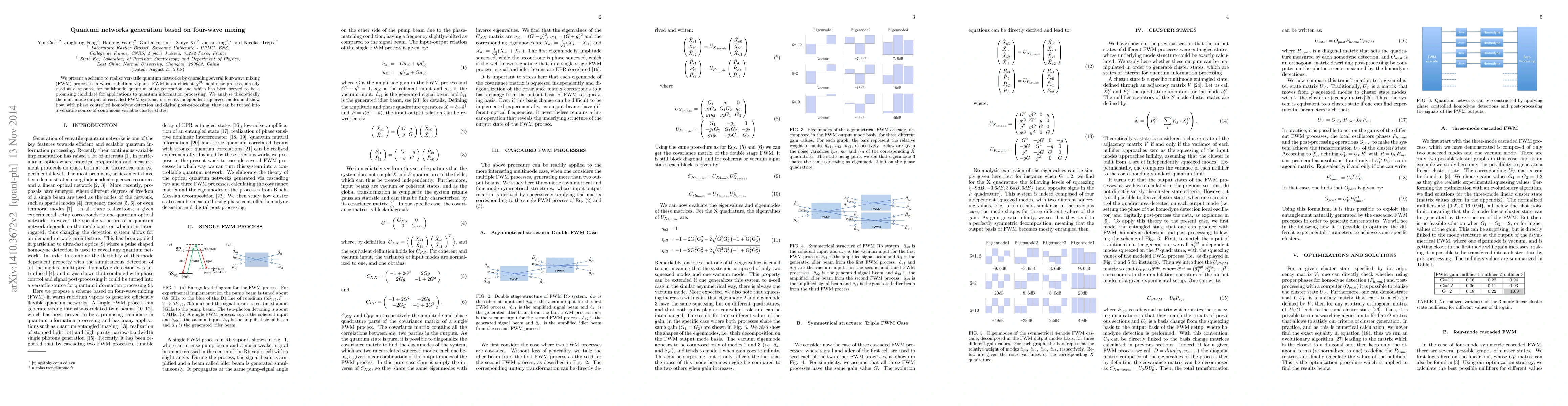 This paper proposes a method to generate versatile quantum networks through cascading four-wave mixing (FWM) processes in warm rubidium vapors, leveraging its $\chi^{(3)}$ nonlinear properties for multimode quantum state generation and quantum information processing. The study theoretically analyzes the multimode output, deriving independent squeezed modes that can be transformed into continuous variable cluster states via phase controlled homodyne detection and digital post-processing.