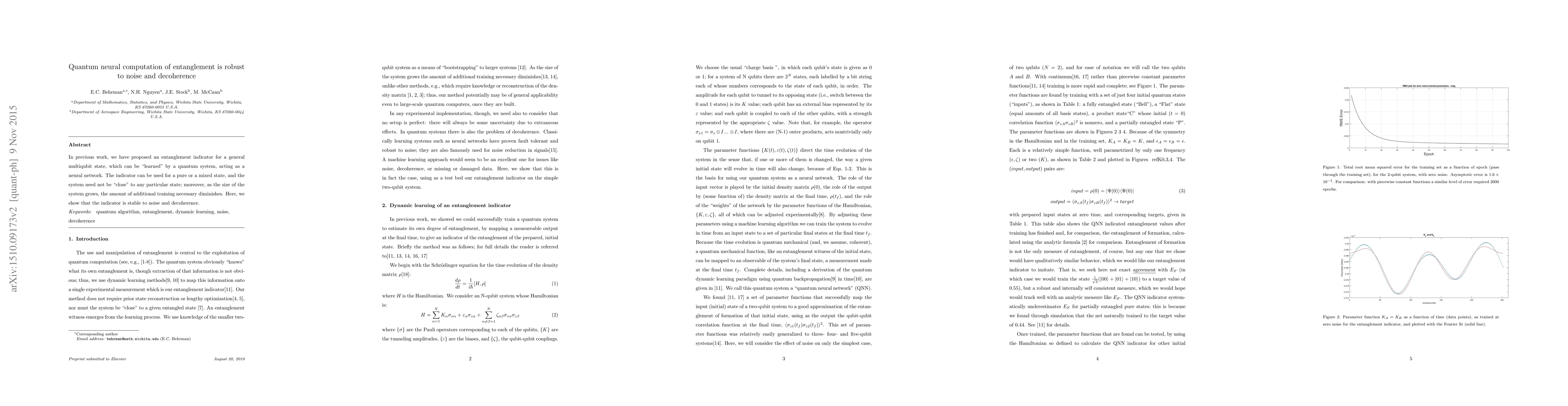 In previous work, we have proposed an entanglement indicator for a general multiqubit state, which can be "learned" by a quantum system, acting as a neural network. The indicator can be used for a pure or a mixed state, and it need not be "close" to any particular state; moreover, as the size of the system grows, the amount of additional training necessary diminishes. Here, we show that the indicator is stable to noise and decoherence.