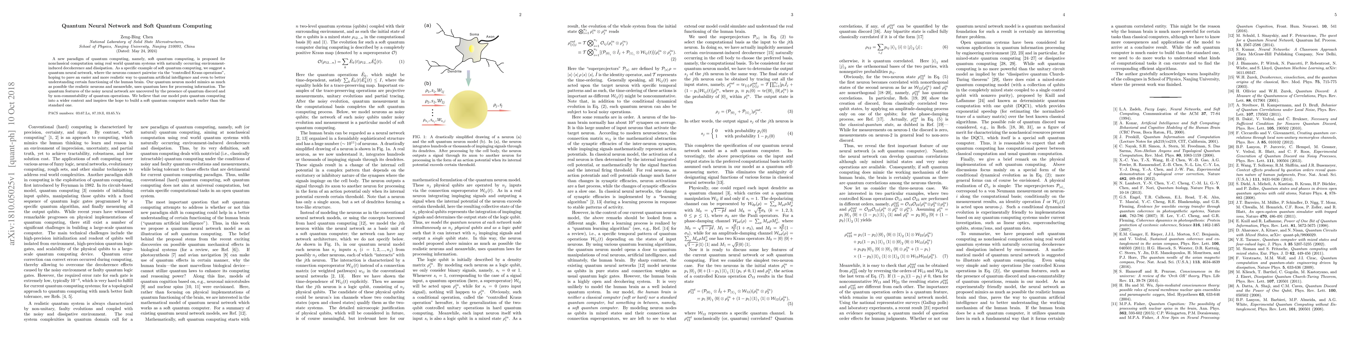 This paper proposes a novel soft quantum computing paradigm utilizing real-world quantum systems with inherent decoherence and dissipation. It introduces a quantum neural network model that connects neurons via controlled Kraus operations, aiming to facilitate quantum artificial intelligence and provide insights into human brain functions.