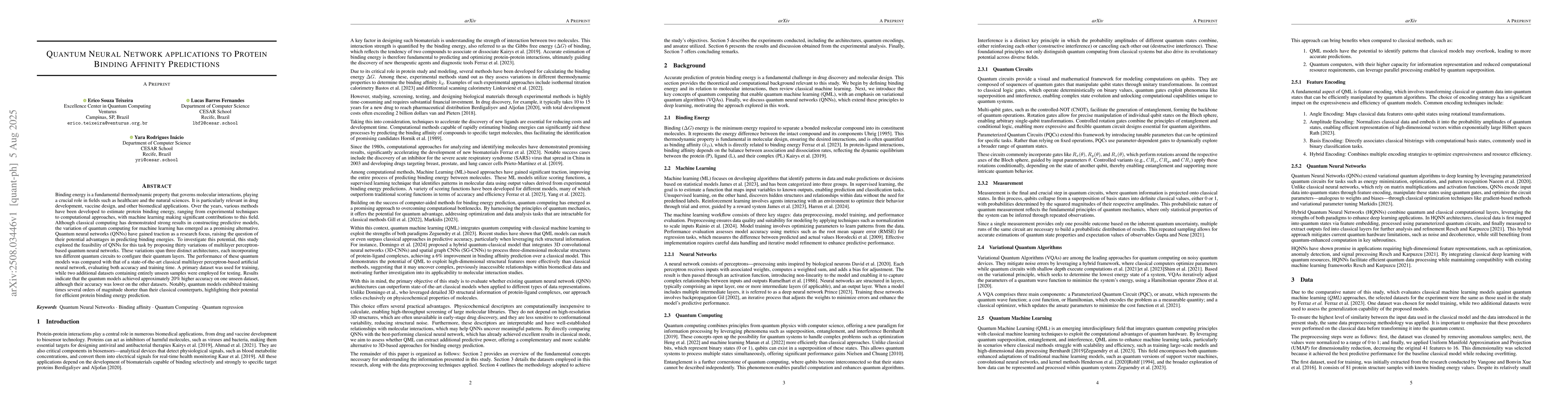 Binding energy is a fundamental thermodynamic property that governs molecular interactions, playing a crucial role in fields such as healthcare and the natural sciences. It is particularly relevant in drug development, vaccine design, and other biomedical applications. Over the years, various methods have been developed to estimate protein binding energy, ranging from experimental techniques to computational approaches, with machine learning making significant contributions to this field. Although classical computing has demonstrated strong results in constructing predictive models, the variation of quantum computing for machine learning has emerged as a promising alternative. Quantum neural networks (QNNs) have gained traction as a research focus, raising the question of their potential advantages in predicting binding energies. To investigate this potential, this study explored the feasibility of QNNs for this task by proposing thirty variations of multilayer perceptron-based quantum neural networks. These variations span three distinct architectures, each incorporating ten different quantum circuits to configure their quantum layers. The performance of these quantum models was compared with that of a state-of-the-art classical multilayer perceptron-based artificial neural network, evaluating both accuracy and training time. A primary dataset was used for training, while two additional datasets containing entirely unseen samples were employed for testing. Results indicate that the quantum models achieved approximately 20% higher accuracy on one unseen dataset, although their accuracy was lower on the other datasets. Notably, quantum models exhibited training times several orders of magnitude shorter than their classical counterparts, highlighting their potential for efficient protein binding energy prediction.