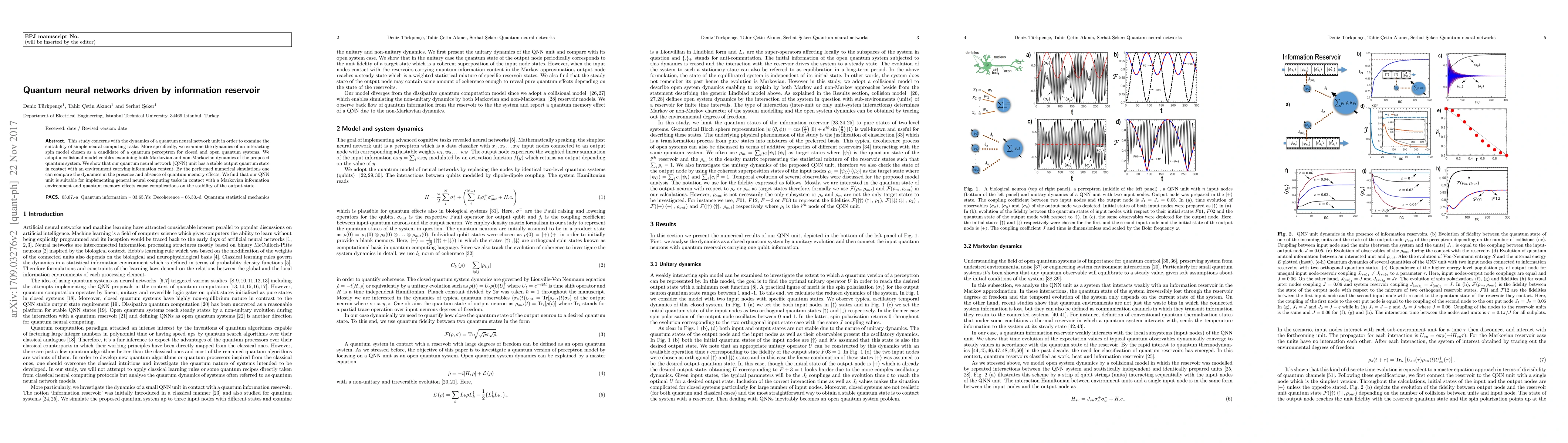 This study concerns with the dynamics of a quantum neural network unit in order to examine the suitability of simple neural computing tasks. More specifically, we examine the dynamics of an interacting spin model chosen as a candidate of a quantum perceptron for closed and open quantum systems. We adopt a collisional model enables examining both Markovian and non-Markovian dynamics of the proposed quantum system. We show that our quantum neural network (QNN) unit has a stable output quantum state in contact with an environment carrying information content. By the performed numerical simulations one can compare the dynamics in the presence and absence of quantum memory effects. We find that our QNN unit is suitable for implementing general neural computing tasks in contact with a Markovian information environment and quantum memory effects cause complications on the stability of the output state.