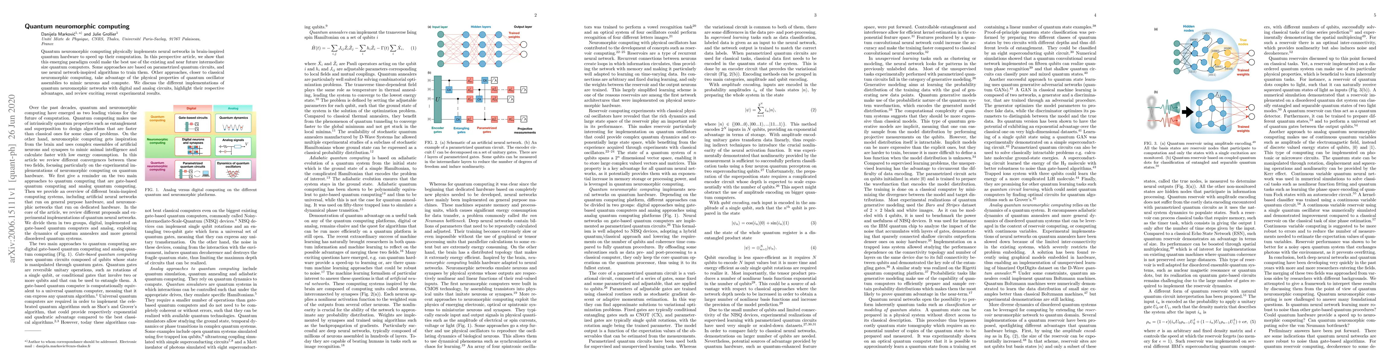 The paper discusses quantum neuromorphic computing, which implements neural networks in quantum hardware to enhance computation speed, leveraging existing and near-future intermediate-size quantum computers.