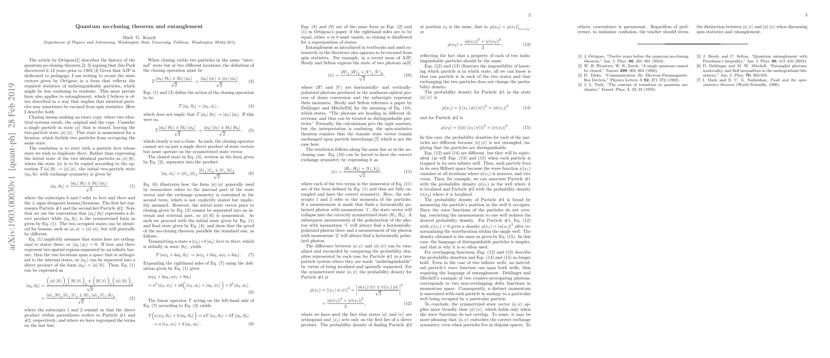 The paper reformulates the quantum no-cloning theorem to maintain spin-statistics correspondence and utilizes this reformulation to analyze entanglement properties. The implications for quantum information theory and entanglement are discussed.