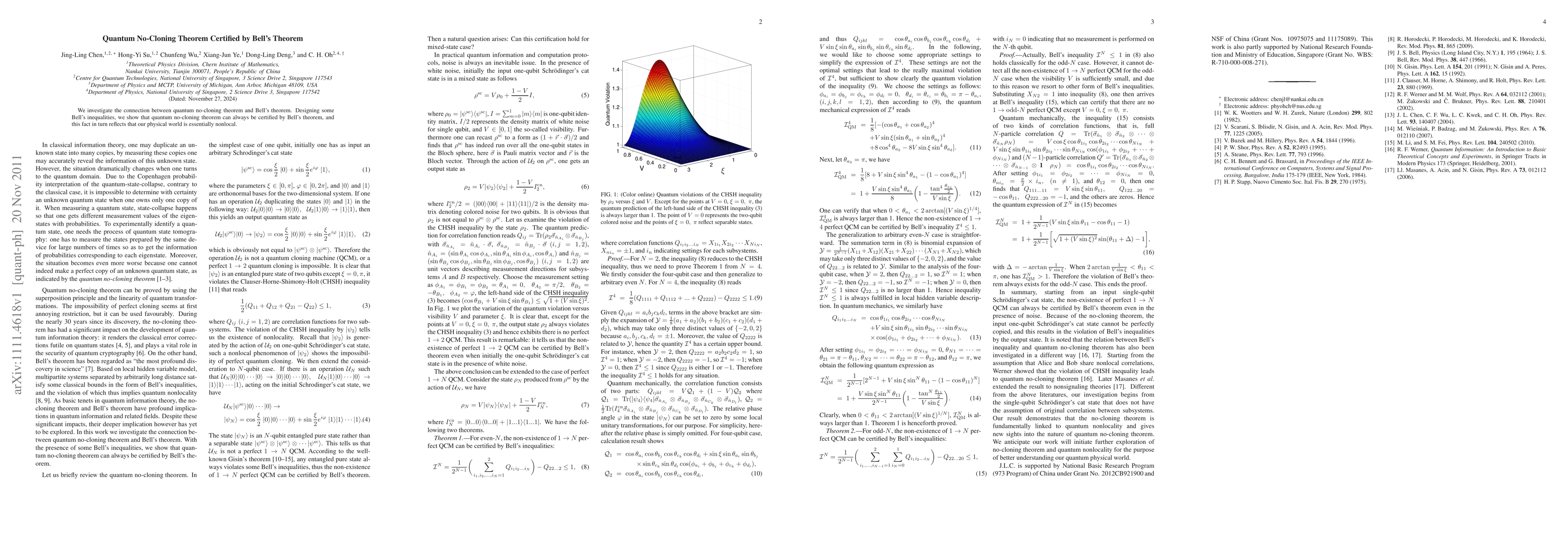 Summary: This paper demonstrates that quantum no-cloning theorem can be certified using Bell's theorem, thereby reinforcing the nonlocal nature of our physical world. The study designs specific Bell inequalities to establish this connection.