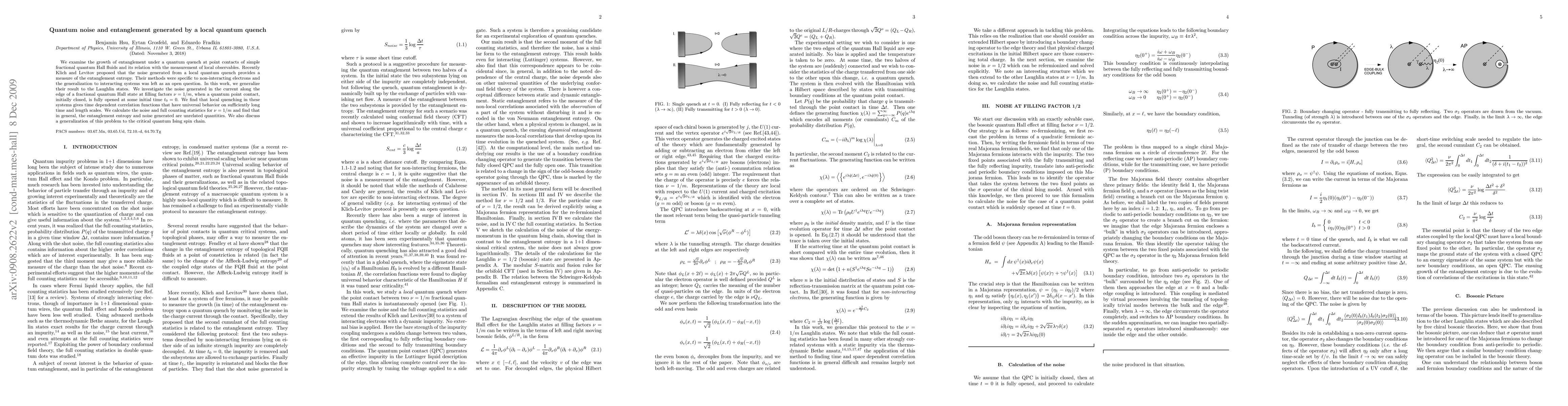 We examine the growth of entanglement under a quantum quench at point contacts of simple fractional quantum Hall fluids and its relation with the measurement of local observables. Recently Klich and Levitov proposed that the noise generated from a local quantum quench provides a measure of the entanglement entropy. Their methods were specific to non-interacting electrons and the generalization to interacting systems was left as an open question. In this work, we generalize their result to the Laughlin states. We investigate the noise generated in the current along the edge of a fractional quantum Hall state at filling factors $\nu=1/m$, when a quantum point contact, initially closed, is fully opened at some initial time $t_0=0$. We find that local quenching in these systems gives time dependent correlation functions that have universal behavior on sufficiently long time and length scales. We calculate the noise and full counting statistics for $\nu=1/m$ and find that in general, the entanglement entropy and noise generated are unrelated quantities. We also discuss a generalization of this problem to the critical quantum Ising spin chain.