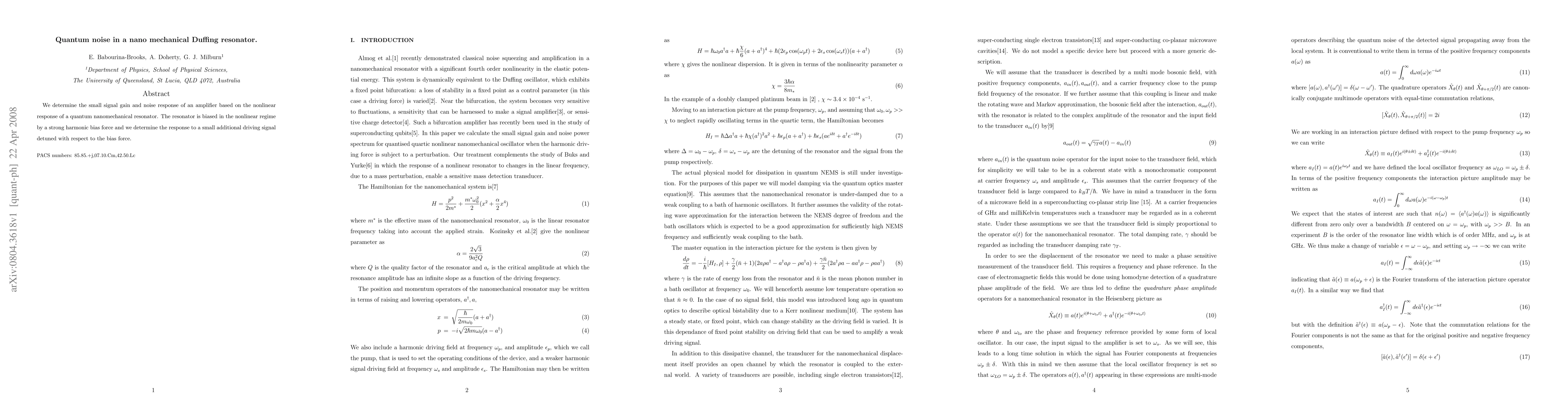 Summary: This study investigates the quantum noise characteristics of a nanomechanical Duffing resonator operating in the nonlinear regime, focusing on its small signal gain and noise response when subjected to a small additional driving signal. The findings provide insights into the resonator's amplification capabilities under such conditions.