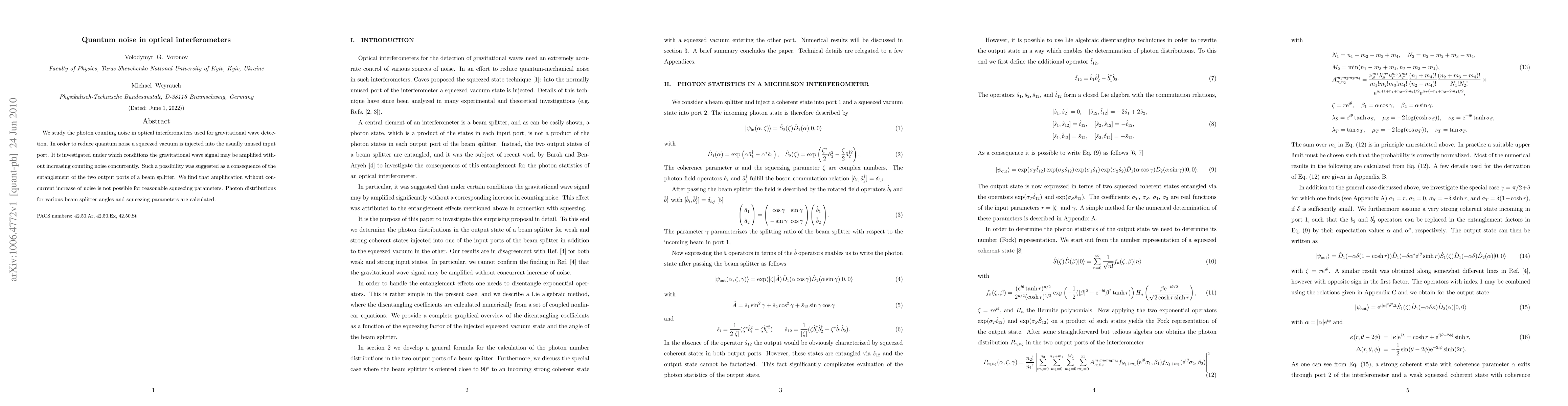 This study investigates photon counting noise in optical interferometers for gravitational wave detection, exploring the use of squeezed vacuum to reduce quantum noise. It concludes that amplifying gravitational wave signals without increasing noise is not feasible under reasonable squeezing conditions, despite the entanglement potential of beam splitter outputs.