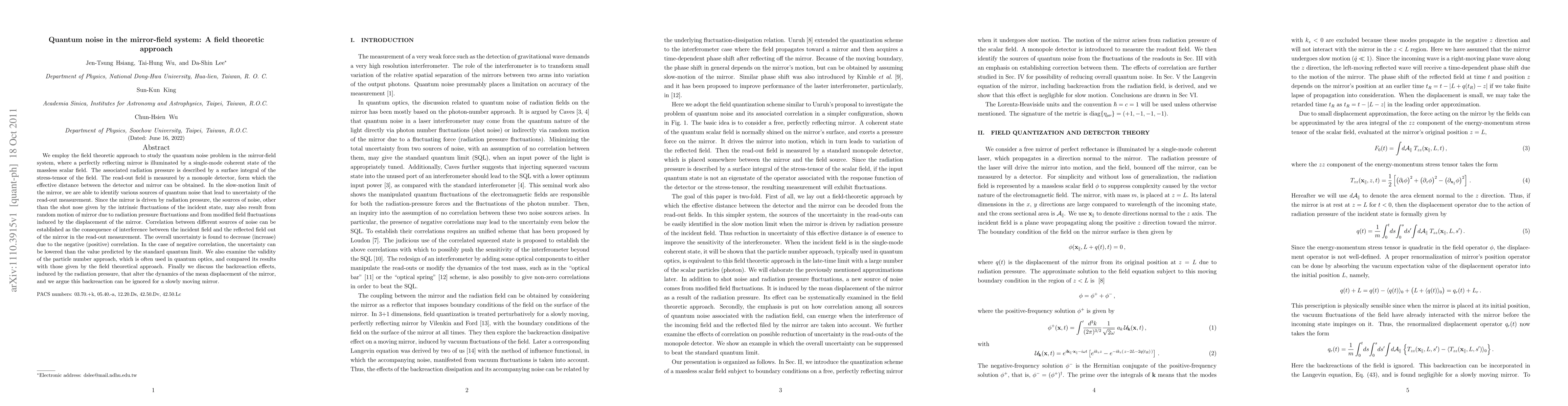 We employ the field theoretic approach to study the quantum noise problem in the mirror-field system, where a perfectly reflecting mirror is illuminated by a single-mode coherent state of the massless scalar field. The associated radiation pressure is described by a surface integral of the stress-tensor of the field. The read-out field is measured by a monople detector, form which the effective distance between the detector and mirror can be obtained. In the slow-motion limit of the mirror, we are able to identify various sources of quantum noise that lead to uncertainty of the read-out measurement. Since the mirror is driven by radiation pressure, the sources of noise, other than the shot nose given by the intrinsic fluctuations of the incident state, may also result from random motion of mirror due to radiation pressure fluctuations and from modified field fluctuations induced by the displacement of the mirror. Correlation between different sources of noise can be established as the consequence of interference between the incident field and the reflected field out of the mirror in the read-out measurement. The overall uncertainty is found to decrease (increase) due to the negative (positive) correlation. In the case of negative correlation, the uncertainty can be lowered than the value predicted by the standard quantum limit. We also examine the validity of the particle number approach, which is often used in quantum optics, and compared its results with those given by the field theoretical approach. Finally we discuss the backreaction effects, induced by the radiation pressure, that alter the dynamics of the mean displacement of the mirror, and we argue this backreaction can be ignored for a slowly moving mirror.