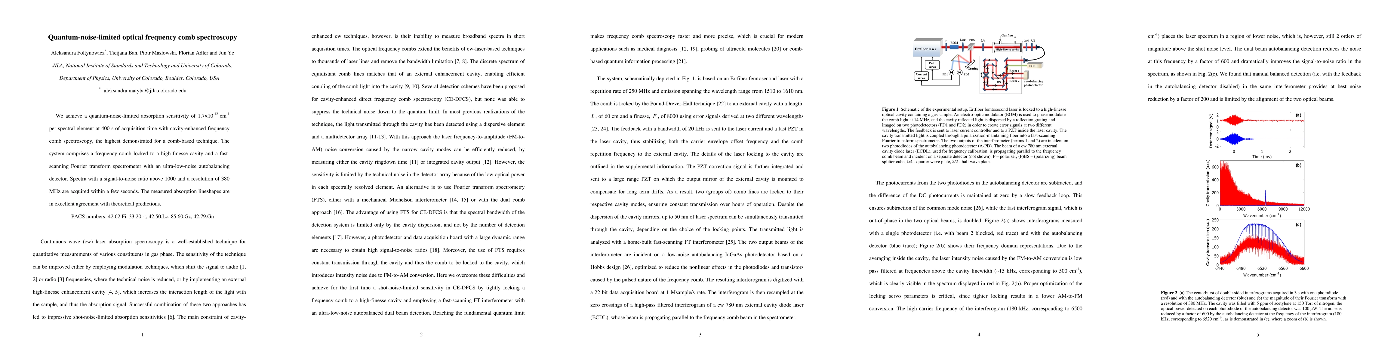This paper reports a quantum-noise-limited optical frequency comb spectroscopy system achieving an unprecedented absorption sensitivity of 1.7 × 10$^{-12}$ cm$^{-1}$ per spectral element, demonstrating the highest sensitivity for comb-based techniques. The system utilizes a high-finesse cavity and a low-noise autobalancing detector to achieve spectra with high signal-to-noise ratios and resolution.