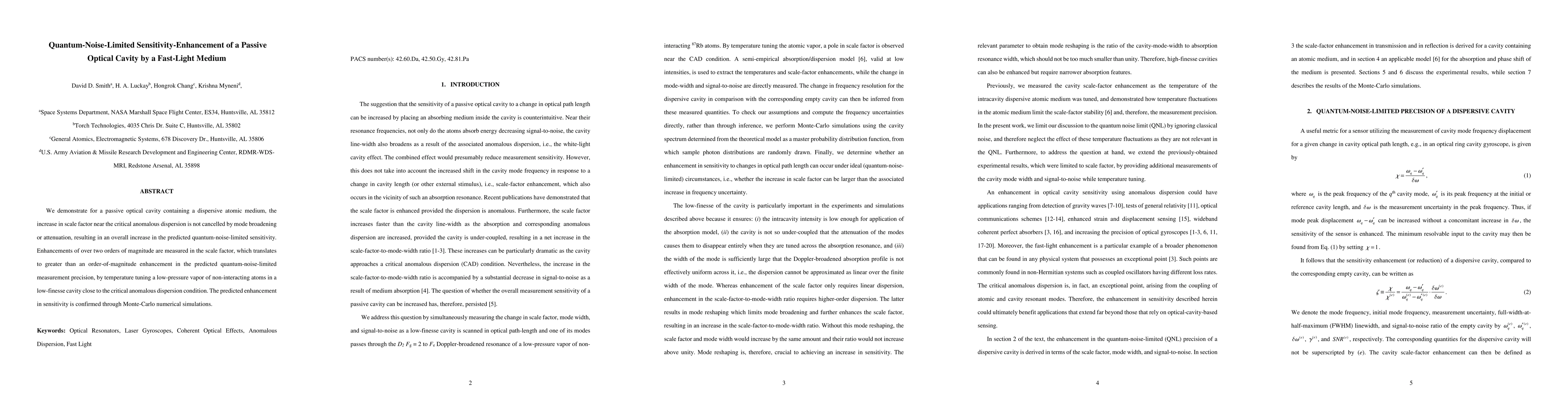 This paper demonstrates a significant enhancement in quantum-noise-limited sensitivity for a passive optical cavity using a dispersive atomic medium near critical anomalous dispersion, achieving over two orders of magnitude improvement in scale factor and more than an order-of-magnitude increase in measurement precision. The results are validated through Monte-Carlo simulations.