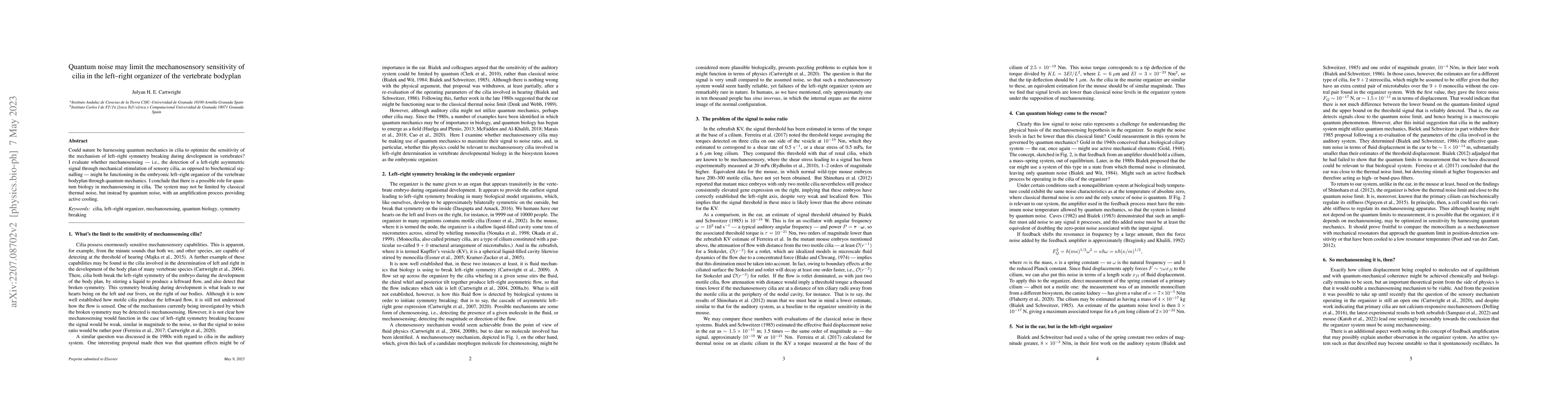 Could nature be harnessing quantum mechanics in cilia to optimize the sensitivity of the mechanism of left-right symmetry breaking during development in vertebrates? I evaluate whether mechanosensing -- i.e., the detection of a left-right asymmetric signal through mechanical stimulation of sensory cilia, as opposed to biochemical signalling -- might be functioning in the embryonic left-right organizer of the vertebrate bodyplan through quantum mechanics. I conclude that there is a possible role for quantum biology in mechanosensing in cilia. The system may not be limited by classical thermal noise, but instead by quantum noise, with an amplification process providing active cooling.