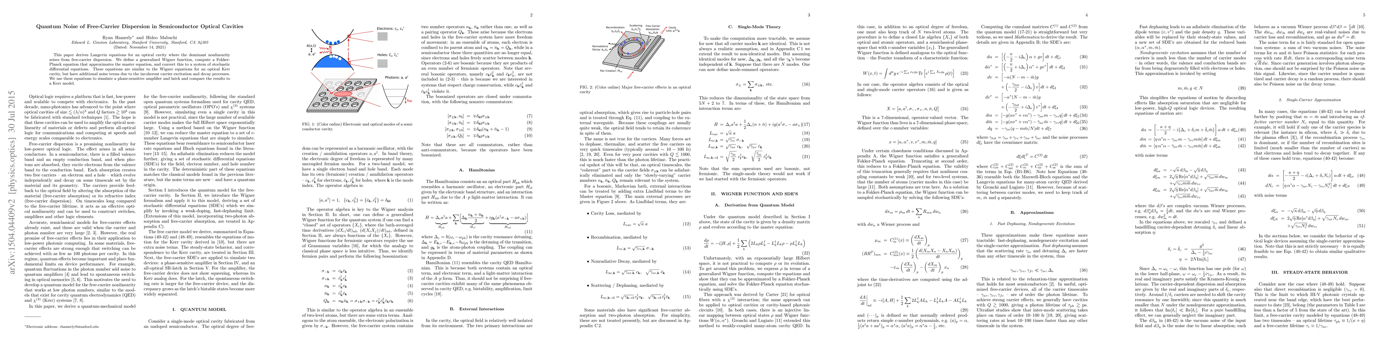This paper derives Langevin equations for an optical cavity where the dominant nonlinearity arises from free-carrier dispersion. We define a generalized Wigner function, compute a Fokker-Planck equation that approximates the master equation, and convert this to a system of stochastic differential equations. These equations are similar to the Wigner equations for an optical Kerr cavity, but have additional noise terms due to the incoherent carrier excitation and decay processes. We use these equations to simulate a phase-sensitive amplifier and latch and compare the results to a Kerr model.
